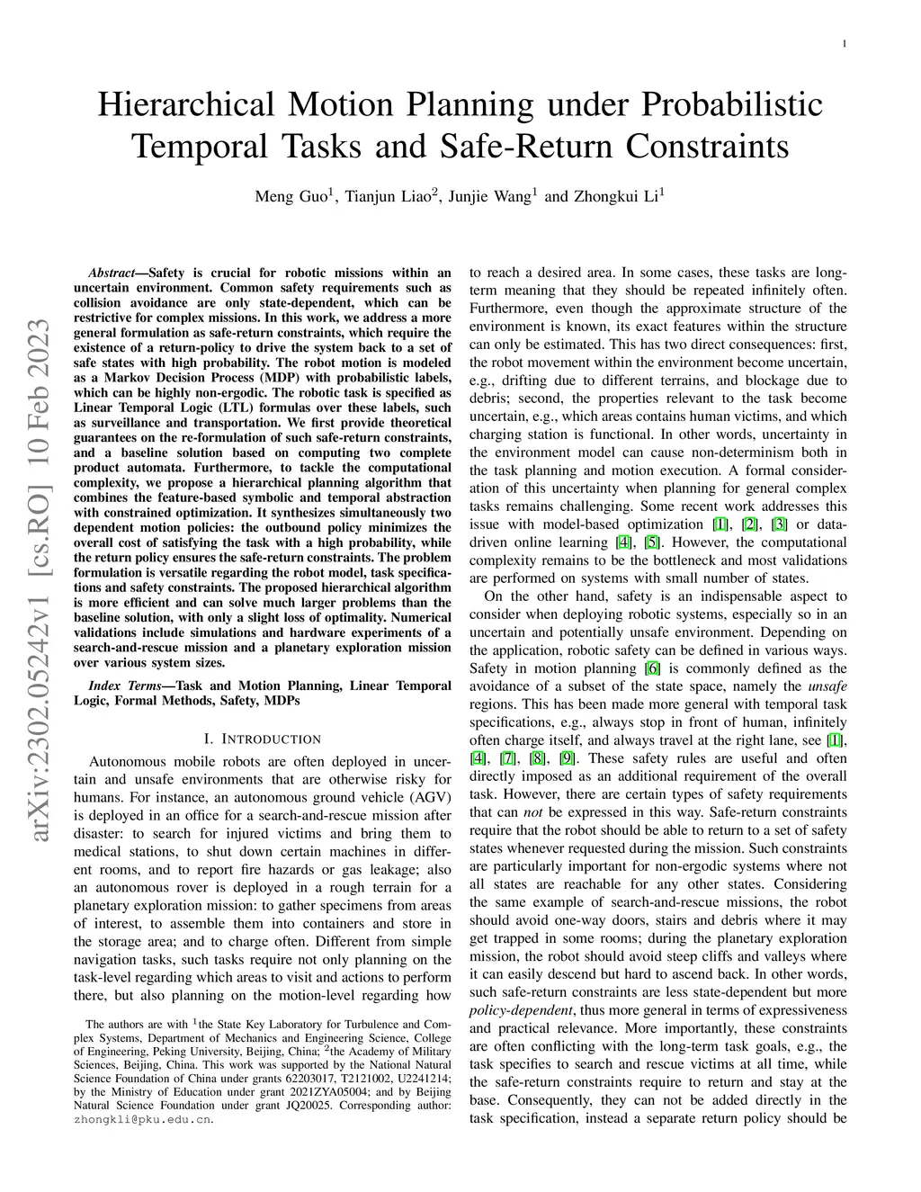 Safety is crucial for robotic missions within an uncertain environment. Common safety requirements such as collision avoidance are only state-dependent, which can be restrictive for complex missions. In this work, we address a more general formulation as safe-return constraints, which require the existence of a return-policy to drive the system back to a set of safe states with high probability. The robot motion is modeled as a Markov Decision Process (MDP) with probabilistic labels, which can be highly non-ergodic. The robotic task is specified as Linear Temporal Logic (LTL) formulas over these labels, such as surveillance and transportation. We first provide theoretical guarantees on the re-formulation of such safe-return constraints, and a baseline solution based on computing two complete product automata. Furthermore, to tackle the computational complexity, we propose a hierarchical planning algorithm that combines the feature-based symbolic and temporal abstraction with constrained optimization. It synthesizes simultaneously two dependent motion policies: the outbound policy minimizes the overall cost of satisfying the task with a high probability, while the return policy ensures the safe-return constraints. The problem formulation is versatile regarding the robot model, task specifications and safety constraints. The proposed hierarchical algorithm is more efficient and can solve much larger problems than the baseline solution, with only a slight loss of optimality. Numerical validations include simulations and hardware experiments of a search-and-rescue mission and a planetary exploration mission over various system sizes.