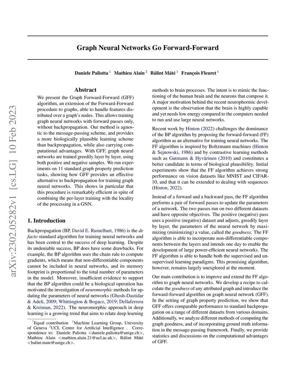 We present the Graph Forward-Forward (GFF) algorithm, an extension of the Forward-Forward procedure to graphs, able to handle features distributed over a graph's nodes. This allows training graph neural networks with forward passes only, without backpropagation. Our method is agnostic to the message-passing scheme, and provides a more biologically plausible learning scheme than backpropagation, while also carrying computational advantages. With GFF, graph neural networks are trained greedily layer by layer, using both positive and negative samples. We run experiments on 11 standard graph property prediction tasks, showing how GFF provides an effective alternative to backpropagation for training graph neural networks. This shows in particular that this procedure is remarkably efficient in spite of combining the per-layer training with the locality of the processing in a GNN.