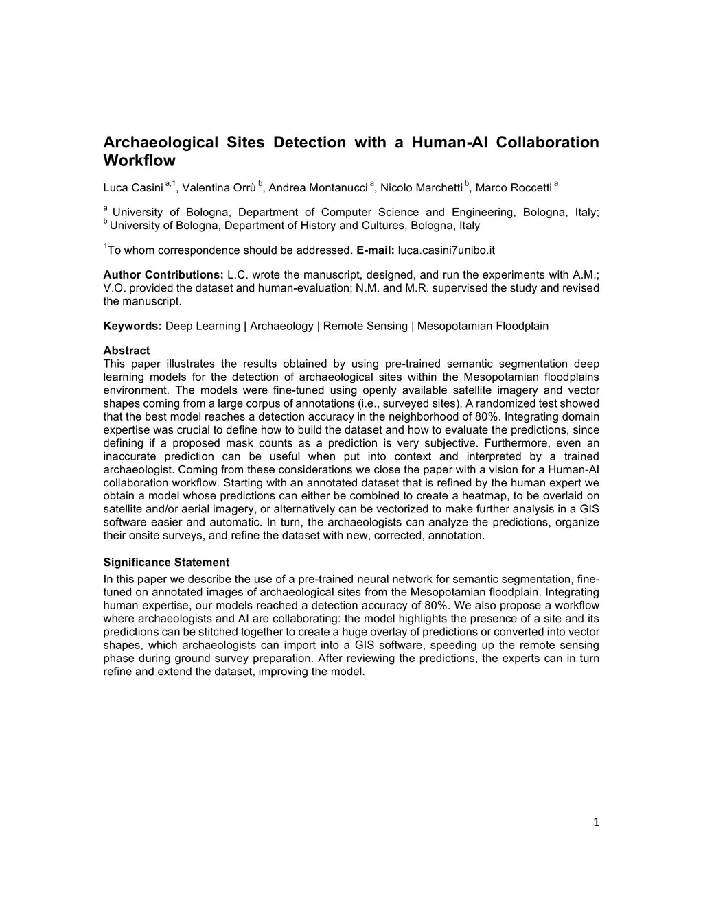This paper illustrates the results obtained by using pre-trained semantic segmentation deep learning models for the detection of archaeological sites within the Mesopotamian floodplains environment. The models were fine-tuned using openly available satellite imagery and vector shapes coming from a large corpus of annotations (i.e., surveyed sites). A randomized test showed that the best model reaches a detection accuracy in the neighborhood of 80%. Integrating domain expertise was crucial to define how to build the dataset and how to evaluate the predictions, since defining if a proposed mask counts as a prediction is very subjective. Furthermore, even an inaccurate prediction can be useful when put into context and interpreted by a trained archaeologist. Coming from these considerations we close the paper with a vision for a Human-AI collaboration workflow. Starting with an annotated dataset that is refined by the human expert we obtain a model whose predictions can either be combined to create a heatmap, to be overlaid on satellite and/or aerial imagery, or alternatively can be vectorized to make further analysis in a GIS software easier and automatic. In turn, the archaeologists can analyze the predictions, organize their onsite surveys, and refine the dataset with new, corrected, annotation