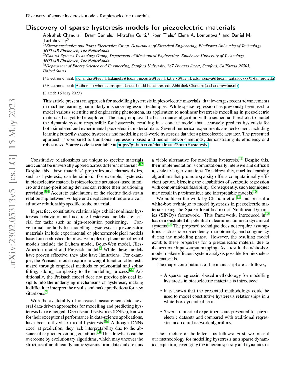 This article presents an approach for modelling hysteresis in piezoelectric materials, that leverages recent advancements in machine learning, particularly in sparse-regression techniques. While sparse regression has previously been used to model various scientific and engineering phenomena, its application to nonlinear hysteresis modelling in piezoelectric materials has yet to be explored. The study employs the least-squares algorithm with a sequential threshold to model the dynamic system responsible for hysteresis, resulting in a concise model that accurately predicts hysteresis for both simulated and experimental piezoelectric material data. Several numerical experiments are performed, including learning butterfly-shaped hysteresis and modelling real-world hysteresis data for a piezoelectric actuator. The presented approach is compared to traditional regression-based and neural network methods, demonstrating its efficiency and robustness. Source code is available at https://github.com/chandratue/SmartHysteresis