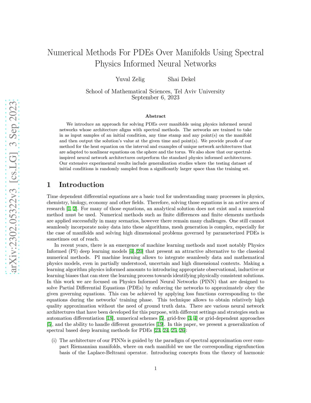 We introduce an approach for solving PDEs over manifolds using physics informed neural networks whose architecture aligns with spectral methods. The networks are trained to take in as input samples of an initial condition, a time stamp and point(s) on the manifold and then output the solution's value at the given time and point(s). We provide proofs of our method for the heat equation on the interval and examples of unique network architectures that are adapted to nonlinear equations on the sphere and the torus. We also show that our spectral-inspired neural network architectures outperform the standard physics informed architectures. Our extensive experimental results include generalization studies where the testing dataset of initial conditions is randomly sampled from a significantly larger space than the training set.