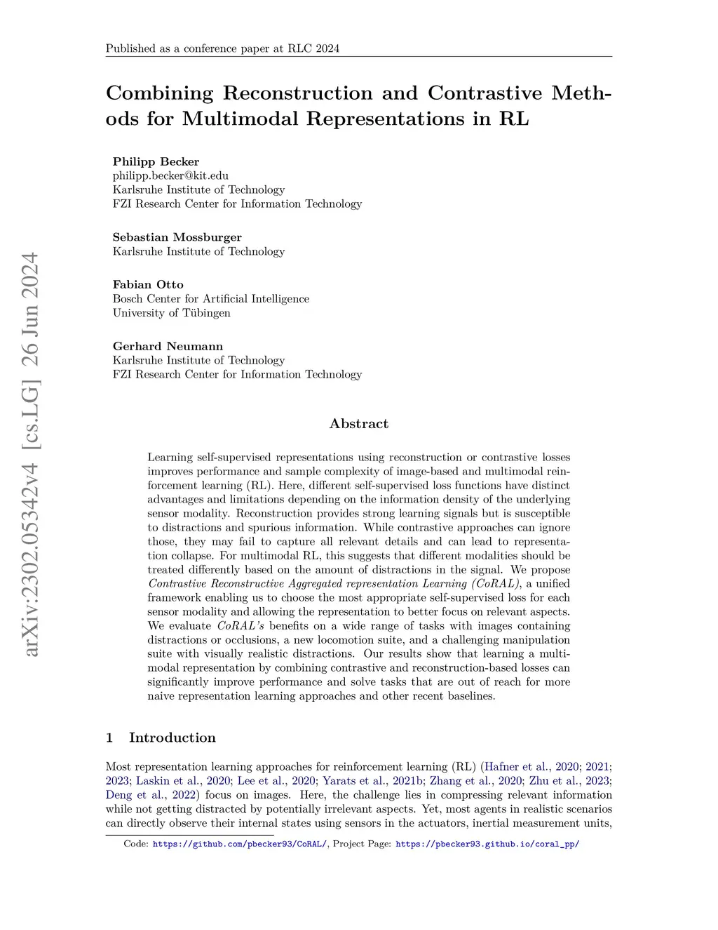 Learning self-supervised representations using reconstruction or contrastive losses improves performance and sample complexity of image-based and multimodal reinforcement learning (RL). Here, different self-supervised loss functions have distinct advantages and limitations depending on the information density of the underlying sensor modality. Reconstruction provides strong learning signals but is susceptible to distractions and spurious information. While contrastive approaches can ignore those, they may fail to capture all relevant details and can lead to representation collapse. For multimodal RL, this suggests that different modalities should be treated differently based on the amount of distractions in the signal. We propose Contrastive Reconstructive Aggregated representation Learning (CoRAL), a unified framework enabling us to choose the most appropriate self-supervised loss for each sensor modality and allowing the representation to better focus on relevant aspects. We evaluate CoRAL's benefits on a wide range of tasks with images containing distractions or occlusions, a new locomotion suite, and a challenging manipulation suite with visually realistic distractions. Our results show that learning a multimodal representation by combining contrastive and reconstruction-based losses can significantly improve performance and solve tasks that are out of reach for more naive representation learning approaches and other recent baselines.