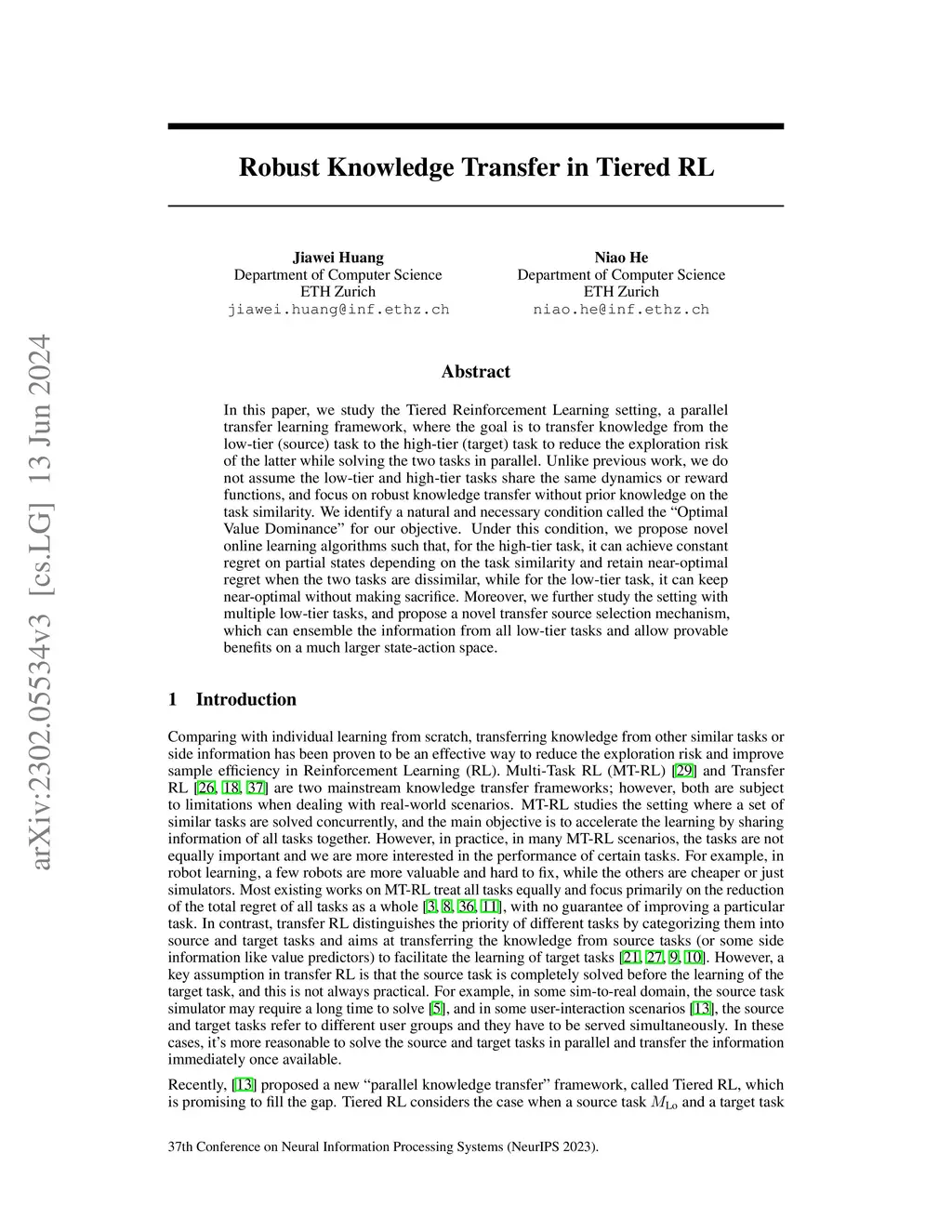 In this paper, we study the Tiered Reinforcement Learning setting, a parallel transfer learning framework, where the goal is to transfer knowledge from the low-tier (source) task to the high-tier (target) task to reduce the exploration risk of the latter while solving the two tasks in parallel. Unlike previous work, we do not assume the low-tier and high-tier tasks share the same dynamics or reward functions, and focus on robust knowledge transfer without prior knowledge on the task similarity. We identify a natural and necessary condition called the ``Optimal Value Dominance'' for our objective. Under this condition, we propose novel online learning algorithms such that, for the high-tier task, it can achieve constant regret on partial states depending on the task similarity and retain near-optimal regret when the two tasks are dissimilar, while for the low-tier task, it can keep near-optimal without making sacrifice. Moreover, we further study the setting with multiple low-tier tasks, and propose a novel transfer source selection mechanism, which can ensemble the information from all low-tier tasks and allow provable benefits on a much larger state-action space.