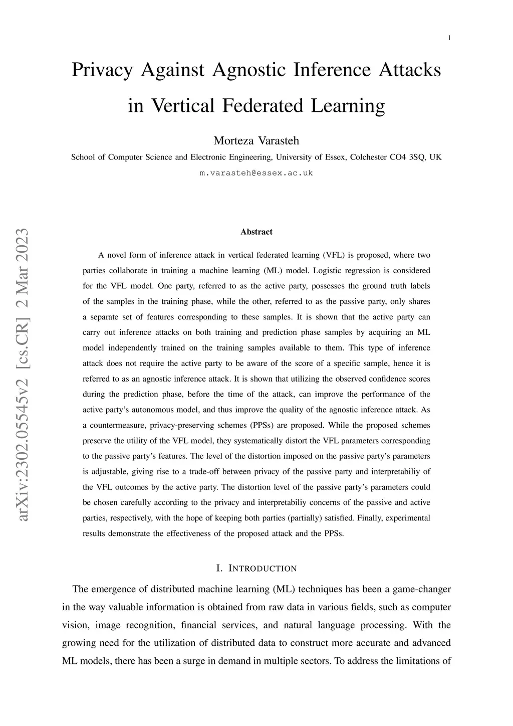A novel form of inference attack in vertical federated learning (VFL) is proposed, where two parties collaborate in training a machine learning (ML) model. Logistic regression is considered for the VFL model. One party, referred to as the active party, possesses the ground truth labels of the samples in the training phase, while the other, referred to as the passive party, only shares a separate set of features corresponding to these samples. It is shown that the active party can carry out inference attacks on both training and prediction phase samples by acquiring an ML model independently trained on the training samples available to them. This type of inference attack does not require the active party to be aware of the score of a specific sample, hence it is referred to as an agnostic inference attack. It is shown that utilizing the observed confidence scores during the prediction phase, before the time of the attack, can improve the performance of the active party's autonomous ML model, and thus improve the quality of the agnostic inference attack. As a countermeasure, privacy-preserving schemes (PPSs) are proposed. While the proposed schemes preserve the utility of the VFL model, they systematically distort the VFL parameters corresponding to the passive party's features. The level of the distortion imposed on the passive party's parameters is adjustable, giving rise to a trade-off between privacy of the passive party and interpretabiliy of the VFL outcomes by the active party. The distortion level of the passive party's parameters could be chosen carefully according to the privacy and interpretabiliy concerns of the passive and active parties, respectively, with the hope of keeping both parties (partially) satisfied. Finally, experimental results demonstrate the effectiveness of the proposed attack and the PPSs.