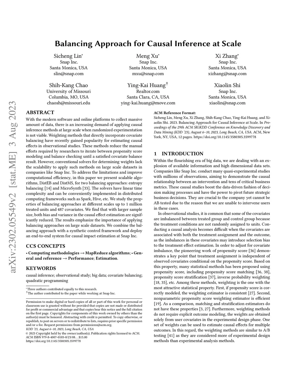 With the modern software and online platforms to collect massive amount of data, there is an increasing demand of applying causal inference methods at large scale when randomized experimentation is not viable. Weighting methods that directly incorporate covariate balancing have recently gained popularity for estimating causal effects in observational studies. These methods reduce the manual efforts required by researchers to iterate between propensity score modeling and balance checking until a satisfied covariate balance result. However, conventional solvers for determining weights lack the scalability to apply such methods on large scale datasets in companies like Snap Inc. To address the limitations and improve computational efficiency, in this paper we present scalable algorithms, DistEB and DistMS, for two balancing approaches: entropy balancing and MicroSynth. The solvers have linear time complexity and can be conveniently implemented in distributed computing frameworks such as Spark, Hive, etc. We study the properties of balancing approaches at different scales up to 1 million treated units and 487 covariates. We find that with larger sample size, both bias and variance in the causal effect estimation are significantly reduced. The results emphasize the importance of applying balancing approaches on large scale datasets. We combine the balancing approach with a synthetic control framework and deploy an end-to-end system for causal impact estimation at Snap Inc.