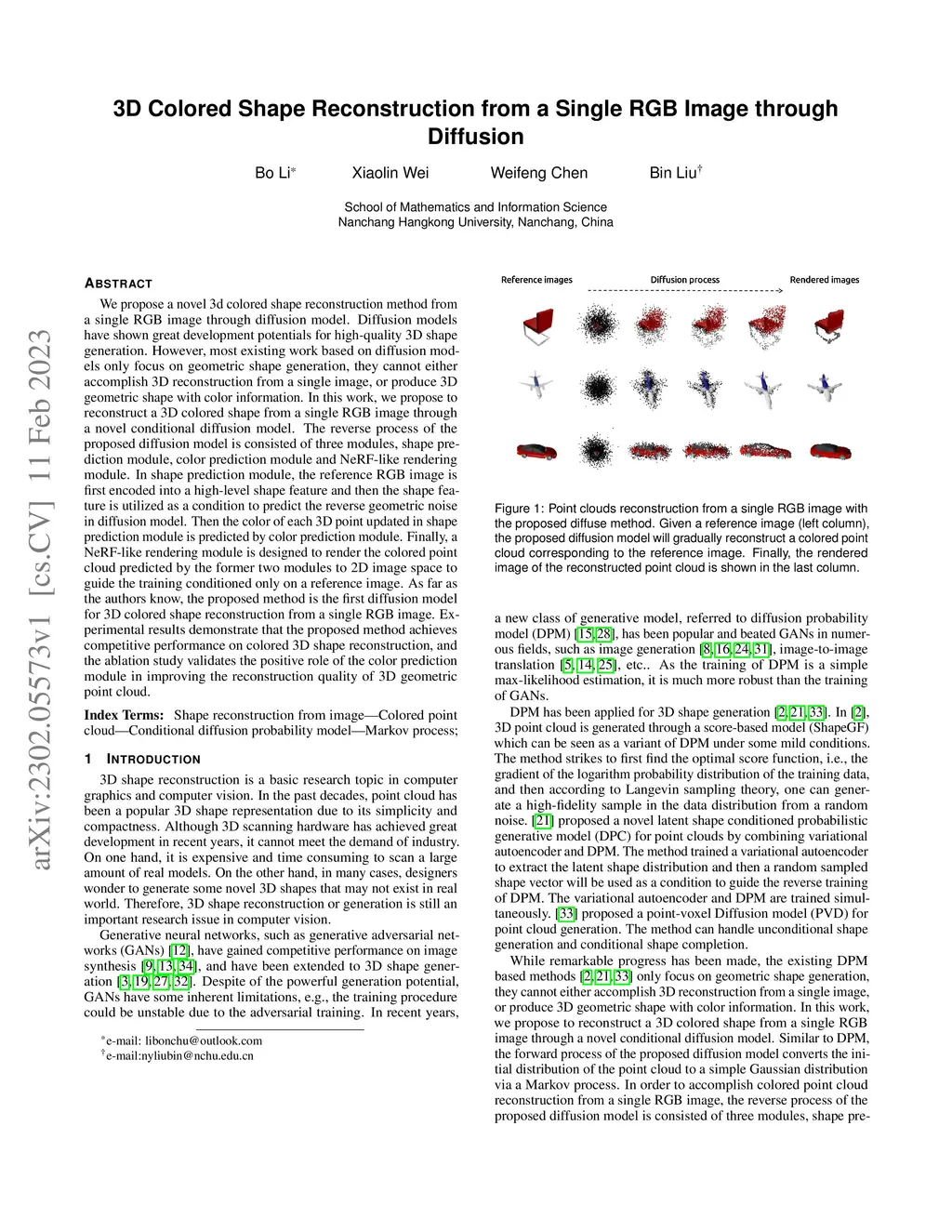We propose a novel 3d colored shape reconstruction method from a single RGB image through diffusion model. Diffusion models have shown great development potentials for high-quality 3D shape generation. However, most existing work based on diffusion models only focus on geometric shape generation, they cannot either accomplish 3D reconstruction from a single image, or produce 3D geometric shape with color information. In this work, we propose to reconstruct a 3D colored shape from a single RGB image through a novel conditional diffusion model. The reverse process of the proposed diffusion model is consisted of three modules, shape prediction module, color prediction module and NeRF-like rendering module. In shape prediction module, the reference RGB image is first encoded into a high-level shape feature and then the shape feature is utilized as a condition to predict the reverse geometric noise in diffusion model. Then the color of each 3D point updated in shape prediction module is predicted by color prediction module. Finally, a NeRF-like rendering module is designed to render the colored point cloud predicted by the former two modules to 2D image space to guide the training conditioned only on a reference image. As far as the authors know, the proposed method is the first diffusion model for 3D colored shape reconstruction from a single RGB image. Experimental results demonstrate that the proposed method achieves competitive performance on colored 3D shape reconstruction, and the ablation study validates the positive role of the color prediction module in improving the reconstruction quality of 3D geometric point cloud.