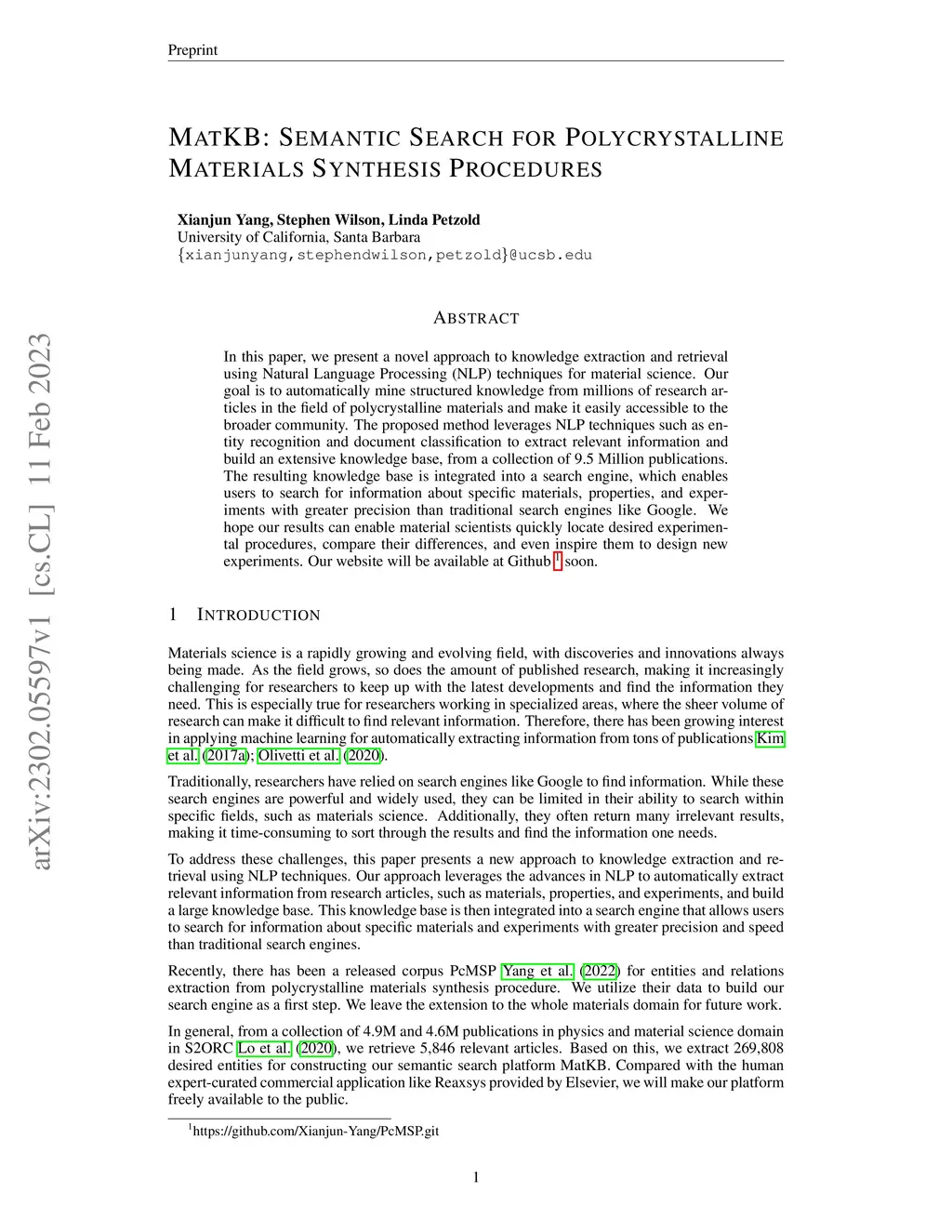 In this paper, we present a novel approach to knowledge extraction and retrieval using Natural Language Processing (NLP) techniques for material science. Our goal is to automatically mine structured knowledge from millions of research articles in the field of polycrystalline materials and make it easily accessible to the broader community. The proposed method leverages NLP techniques such as entity recognition and document classification to extract relevant information and build an extensive knowledge base, from a collection of 9.5 Million publications. The resulting knowledge base is integrated into a search engine, which enables users to search for information about specific materials, properties, and experiments with greater precision than traditional search engines like Google. We hope our results can enable material scientists quickly locate desired experimental procedures, compare their differences, and even inspire them to design new experiments. Our website will be available at Github \footnote{https://github.com/Xianjun-Yang/PcMSP.git} soon.