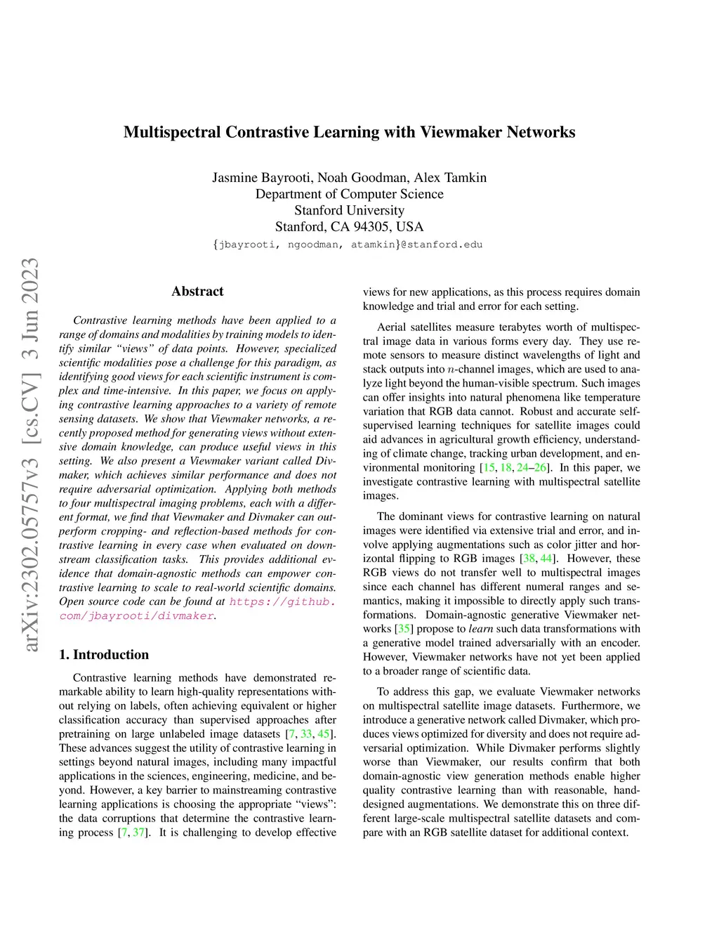 Contrastive learning methods have been applied to a range of domains and modalities by training models to identify similar "views" of data points. However, specialized scientific modalities pose a challenge for this paradigm, as identifying good views for each scientific instrument is complex and time-intensive. In this paper, we focus on applying contrastive learning approaches to a variety of remote sensing datasets. We show that Viewmaker networks, a recently proposed method for generating views, are promising for producing views in this setting without requiring extensive domain knowledge and trial and error. We apply Viewmaker to four multispectral imaging problems, each with a different format, finding that Viewmaker can outperform cropping- and reflection-based methods for contrastive learning in every case when evaluated on downstream classification tasks. This provides additional evidence that domain-agnostic methods can empower contrastive learning to scale to real-world scientific domains. Open source code can be found at https://github.com/jbayrooti/divmaker.