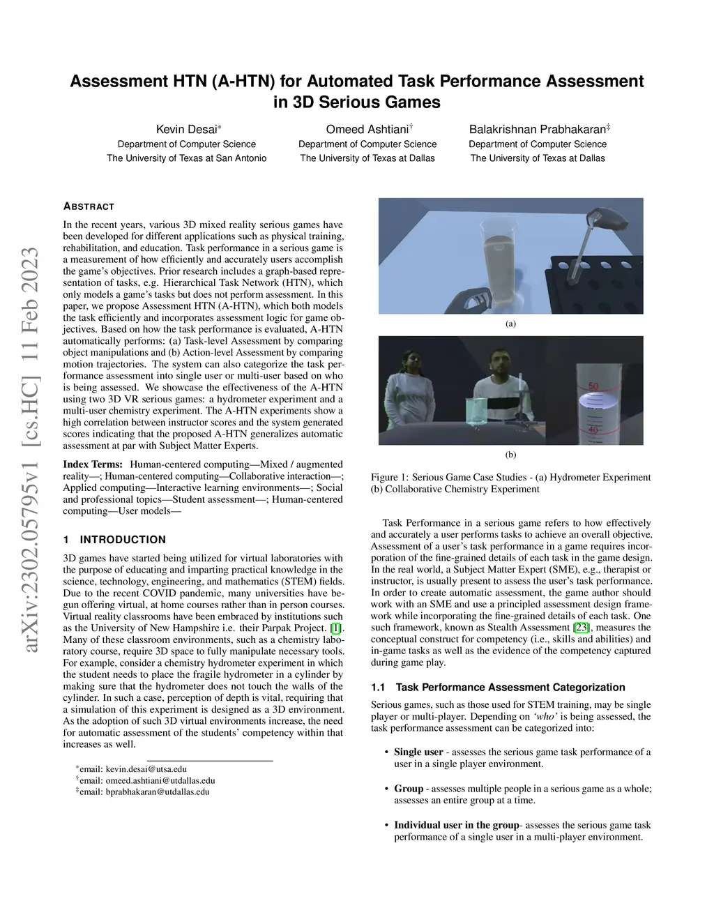 In the recent years, various 3D mixed reality serious games have been developed for different applications such as physical training, rehabilitation, and education. Task performance in a serious game is a measurement of how efficiently and accurately users accomplish the game's objectives. Prior research includes a graph-based representation of tasks, e.g. Hierarchical Task Network (HTN), which only models a game's tasks but does not perform assessment. In this paper, we propose Assessment HTN (A-HTN), which both models the task efficiently and incorporates assessment logic for game objectives. Based on how the task performance is evaluated, A-HTN automatically performs: (a) Task-level Assessment by comparing object manipulations and (b) Action-level Assessment by comparing motion trajectories. The system can also categorize the task performance assessment into single user or multi-user based on who is being assessed. We showcase the effectiveness of the A-HTN using two 3D VR serious games: a hydrometer experiment and a multi-user chemistry experiment. The A-HTN experiments show a high correlation between instructor scores and the system generated scores indicating that the proposed A-HTN generalizes automatic assessment at par with Subject Matter Experts.