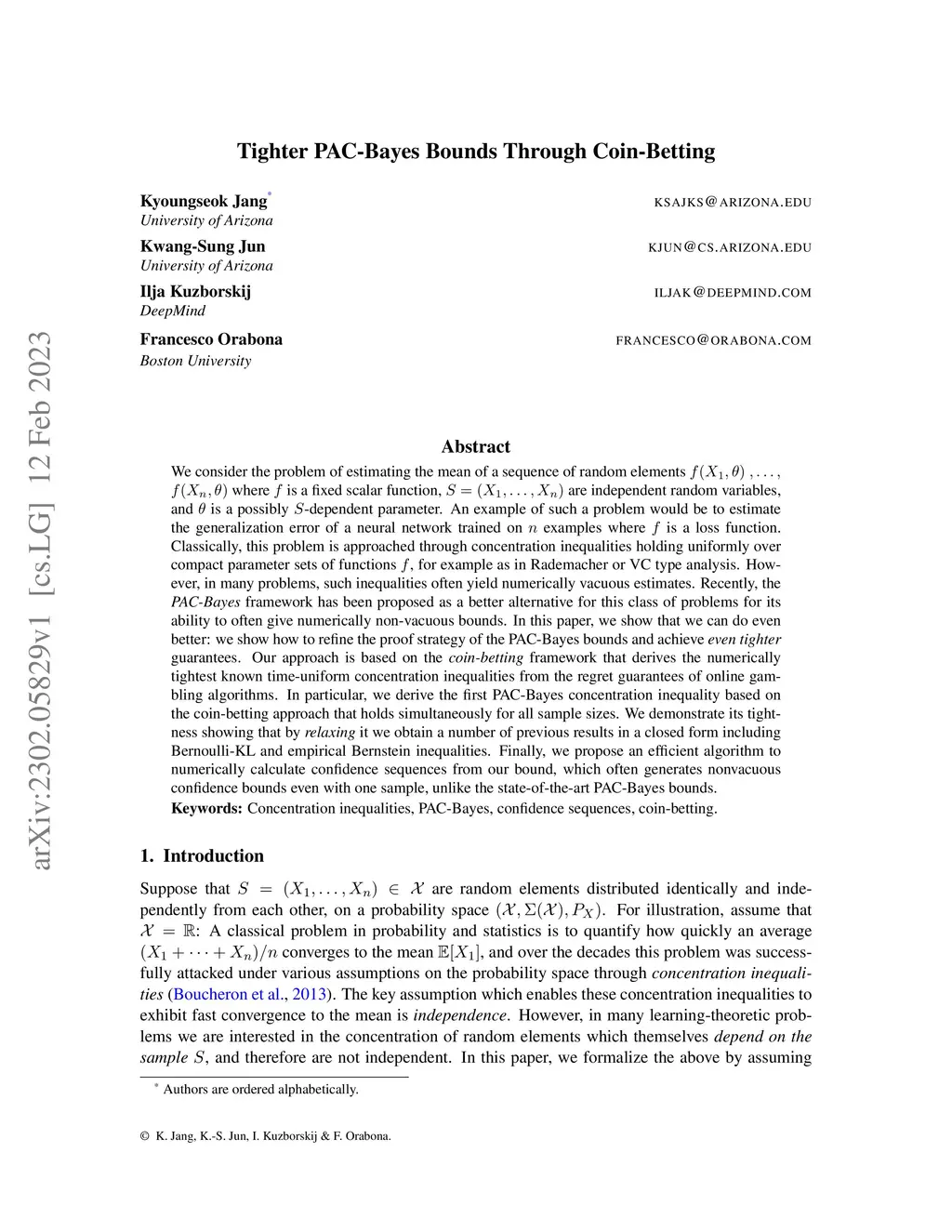 We consider the problem of estimating the mean of a sequence of random elements $, \ldots, $ where is a fixed scalar function, are independent random variables, and is a possibly -dependent parameter. An example of such a problem would be to estimate the generalization error of a neural network trained on examples where is a loss function. Classically, this problem is approached through concentration inequalities holding uniformly over compact parameter sets of functions , for example as in Rademacher or VC type analysis. However, in many problems, such inequalities often yield numerically vacuous estimates. Recently, the \emph{PAC-Bayes} framework has been proposed as a better alternative for this class of problems for its ability to often give numerically non-vacuous bounds. In this paper, we show that we can do even better: we show how to refine the proof strategy of the PAC-Bayes bounds and achieve \emph{even tighter} guarantees. Our approach is based on the \emph{coin-betting} framework that derives the numerically tightest known time-uniform concentration inequalities from the regret guarantees of online gambling algorithms. In particular, we derive the first PAC-Bayes concentration inequality based on the coin-betting approach that holds simultaneously for all sample sizes. We demonstrate its tightness showing that by \emph{relaxing} it we obtain a number of previous results in a closed form including Bernoulli-KL and empirical Bernstein inequalities. Finally, we propose an efficient algorithm to numerically calculate confidence sequences from our bound, which often generates nonvacuous confidence bounds even with one sample, unlike the state-of-the-art PAC-Bayes bounds.