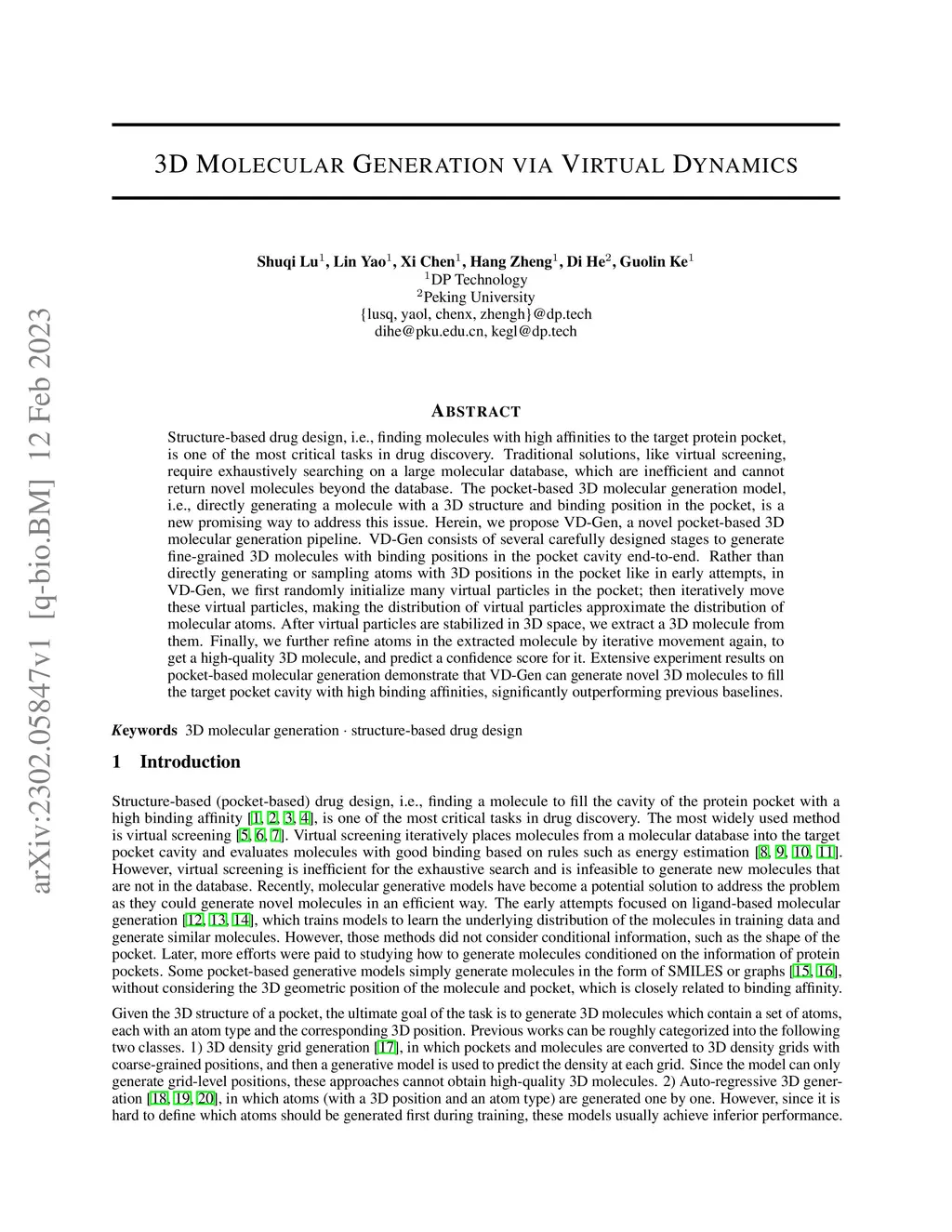 Structure-based drug design, i.e., finding molecules with high affinities to the target protein pocket, is one of the most critical tasks in drug discovery. Traditional solutions, like virtual screening, require exhaustively searching on a large molecular database, which are inefficient and cannot return novel molecules beyond the database. The pocket-based 3D molecular generation model, i.e., directly generating a molecule with a 3D structure and binding position in the pocket, is a new promising way to address this issue. Herein, we propose VD-Gen, a novel pocket-based 3D molecular generation pipeline. VD-Gen consists of several carefully designed stages to generate fine-grained 3D molecules with binding positions in the pocket cavity end-to-end. Rather than directly generating or sampling atoms with 3D positions in the pocket like in early attempts, in VD-Gen, we first randomly initialize many virtual particles in the pocket; then iteratively move these virtual particles, making the distribution of virtual particles approximate the distribution of molecular atoms. After virtual particles are stabilized in 3D space, we extract a 3D molecule from them. Finally, we further refine atoms in the extracted molecule by iterative movement again, to get a high-quality 3D molecule, and predict a confidence score for it. Extensive experiment results on pocket-based molecular generation demonstrate that VD-Gen can generate novel 3D molecules to fill the target pocket cavity with high binding affinities, significantly outperforming previous baselines.