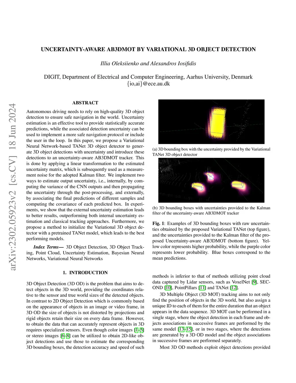 Autonomous driving needs to rely on high-quality 3D object detection to ensure safe navigation in the world. Uncertainty estimation is an effective tool to provide statistically accurate predictions, while the associated detection uncertainty can be used to implement a more safe navigation protocol or include the user in the loop. In this paper, we propose a Variational Neural Network-based TANet 3D object detector to generate 3D object detections with uncertainty and introduce these detections to an uncertainty-aware AB3DMOT tracker. This is done by applying a linear transformation to the estimated uncertainty matrix, which is subsequently used as a measurement noise for the adopted Kalman filter. We implement two ways to estimate output uncertainty, i.e., internally, by computing the variance of the CNN outputs and then propagating the uncertainty through the post-processing, and externally, by associating the final predictions of different samples and computing the covariance of each predicted box. In experiments, we show that the external uncertainty estimation leads to better results, outperforming both internal uncertainty estimation and classical tracking approaches. Furthermore, we propose a method to initialize the Variational 3D object detector with a pretrained TANet model, which leads to the best performing models.