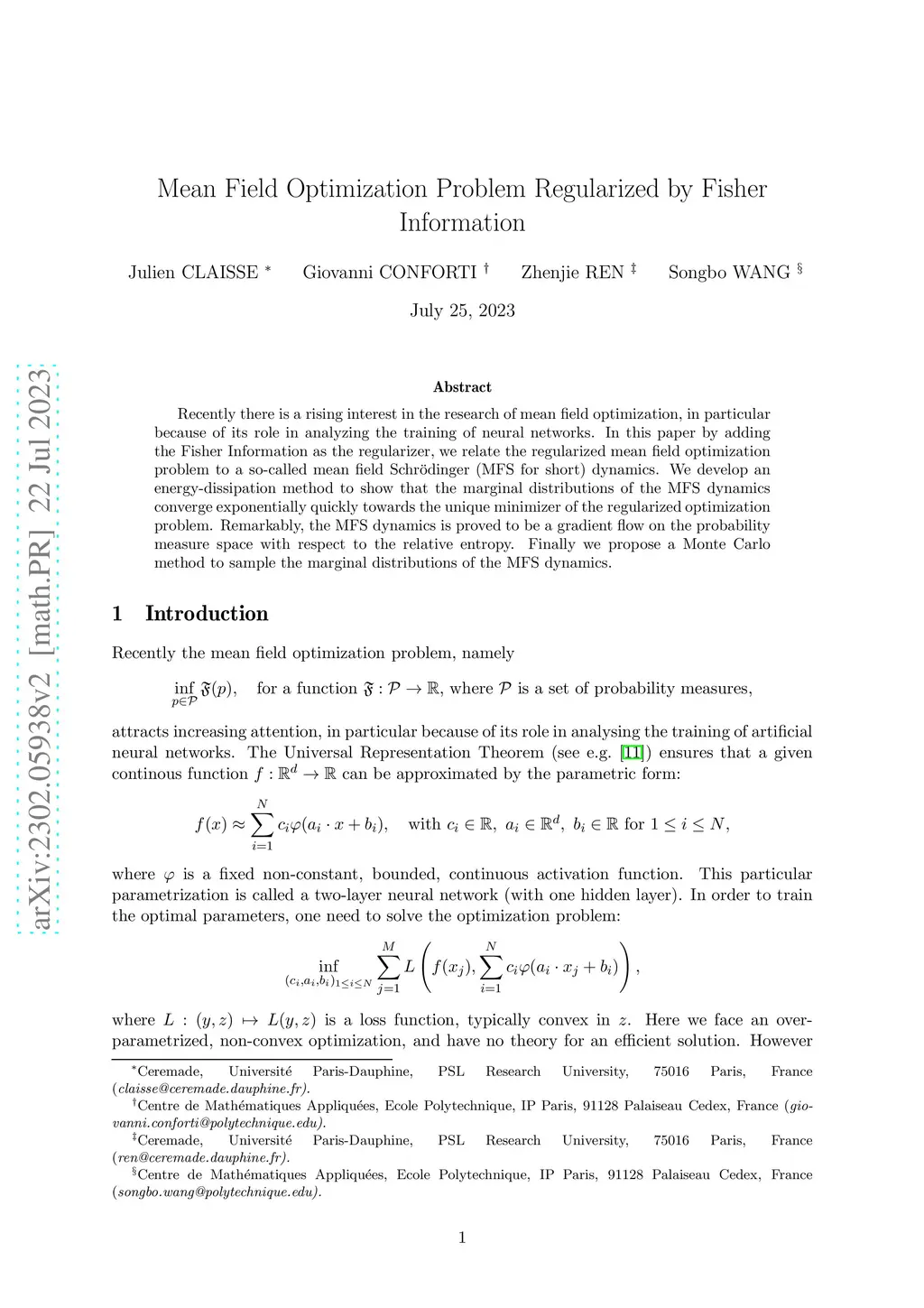 Mean Field Optimization Problem Regularized by Fisher Information