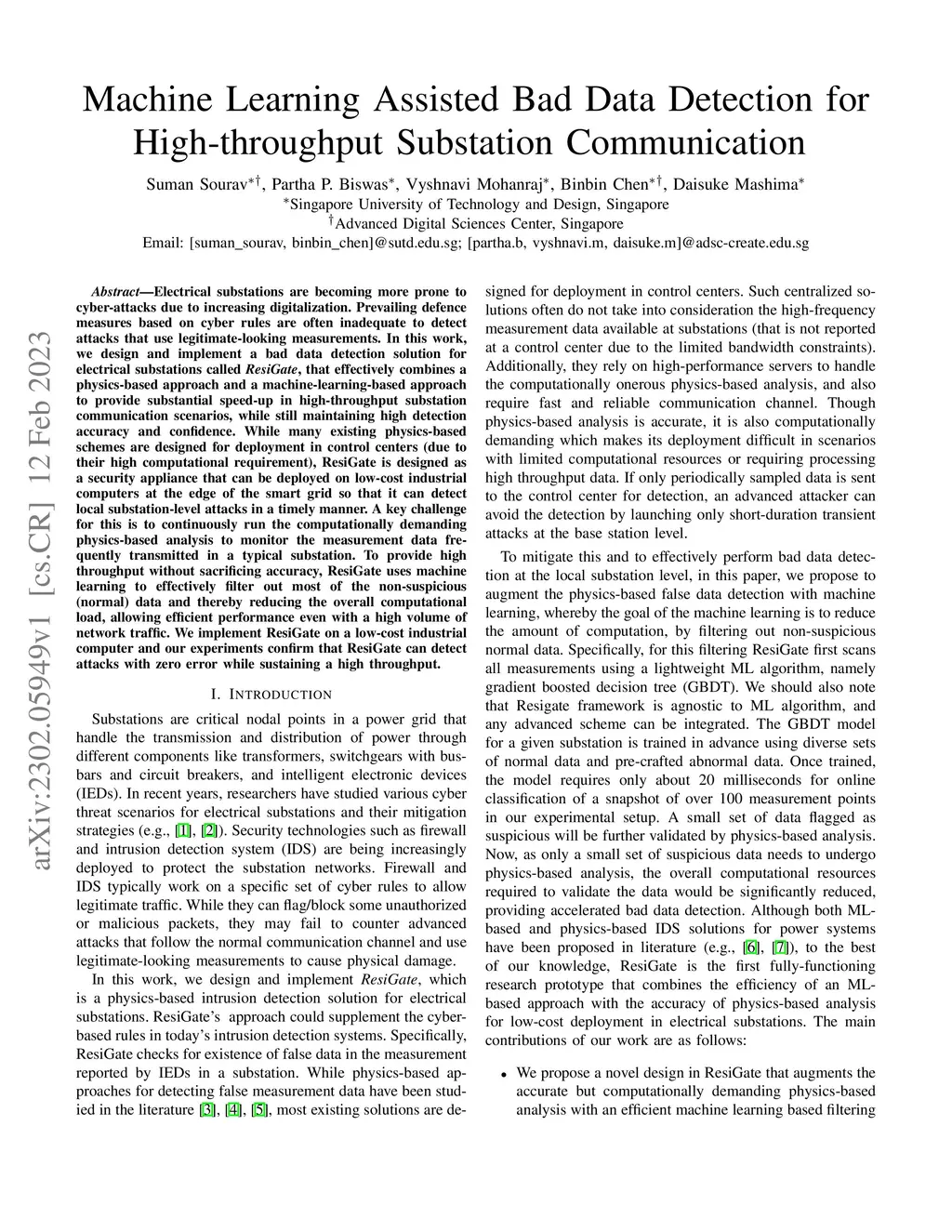Electrical substations are becoming more prone to cyber-attacks due to increasing digitalization. Prevailing defense measures based on cyber rules are often inadequate to detect attacks that use legitimate-looking measurements. In this work, we design and implement a bad data detection solution for electrical substations called ResiGate, that effectively combines a physics-based approach and a machine-learning-based approach to provide substantial speed-up in high-throughput substation communication scenarios, while still maintaining high detection accuracy and confidence. While many existing physics-based schemes are designed for deployment in control centers (due to their high computational requirement), ResiGate is designed as a security appliance that can be deployed on low-cost industrial computers at the edge of the smart grid so that it can detect local substation-level attacks in a timely manner. A key challenge for this is to continuously run the computationally demanding physics-based analysis to monitor the measurement data frequently transmitted in a typical substation. To provide high throughput without sacrificing accuracy, ResiGate uses machine learning to effectively filter out most of the non-suspicious (normal) data and thereby reducing the overall computational load, allowing efficient performance even with a high volume of network traffic. We implement ResiGate on a low-cost industrial computer and our experiments confirm that ResiGate can detect attacks with zero error while sustaining a high throughput.