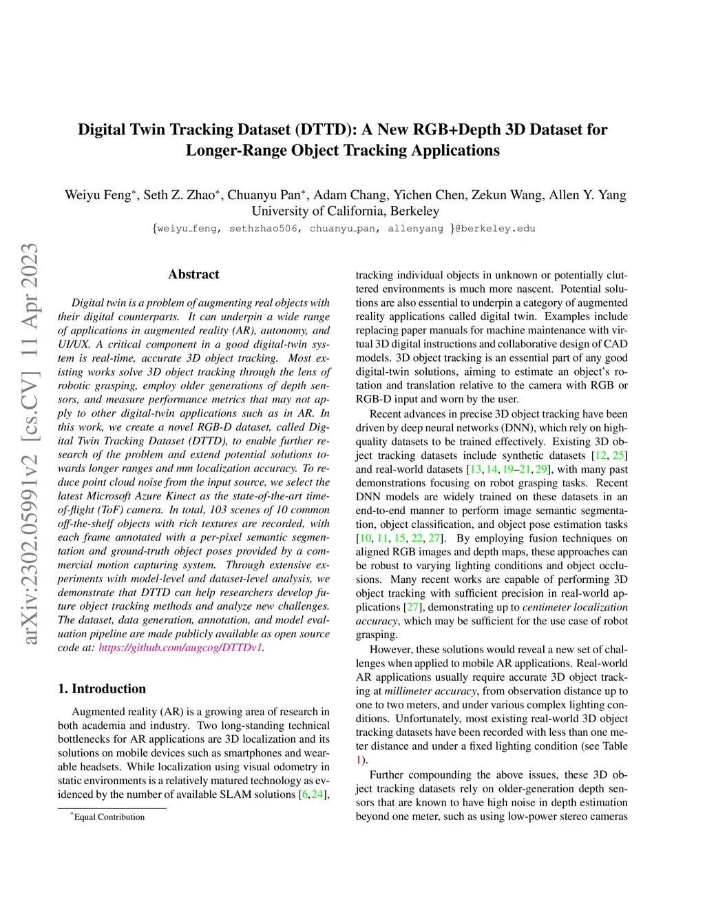 Digital twin is a problem of augmenting real objects with their digital counterparts. It can underpin a wide range of applications in augmented reality (AR), autonomy, and UI/UX. A critical component in a good digital-twin system is real-time, accurate 3D object tracking. Most existing works solve 3D object tracking through the lens of robotic grasping, employ older generations of depth sensors, and measure performance metrics that may not apply to other digital-twin applications such as in AR. In this work, we create a novel RGB-D dataset, called Digital Twin Tracking Dataset (DTTD), to enable further research of the problem and extend potential solutions towards longer ranges and mm localization accuracy. To reduce point cloud noise from the input source, we select the latest Microsoft Azure Kinect as the state-of-the-art time-of-flight (ToF) camera. In total, 103 scenes of 10 common off-the-shelf objects with rich textures are recorded, with each frame annotated with a per-pixel semantic segmentation and ground-truth object poses provided by a commercial motion capturing system. Through extensive experiments with model-level and dataset-level analysis, we demonstrate that DTTD can help researchers develop future object tracking methods and analyze new challenges. The dataset, data generation, annotation, and model evaluation pipeline are made publicly available as open source code at: https://github.com/augcog/DTTDv1.