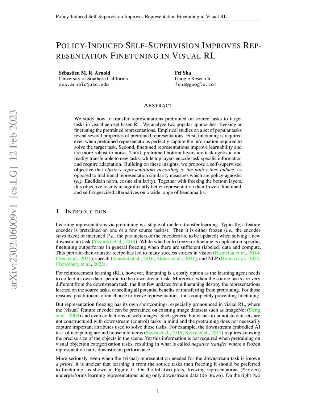 We study how to transfer representations pretrained on source tasks to target tasks in visual percept based RL. We analyze two popular approaches: freezing or finetuning the pretrained representations. Empirical studies on a set of popular tasks reveal several properties of pretrained representations. First, finetuning is required even when pretrained representations perfectly capture the information required to solve the target task. Second, finetuned representations improve learnability and are more robust to noise. Third, pretrained bottom layers are task-agnostic and readily transferable to new tasks, while top layers encode task-specific information and require adaptation. Building on these insights, we propose a self-supervised objective that clusters representations according to the policy they induce, as opposed to traditional representation similarity measures which are policy-agnostic (e.g. Euclidean norm, cosine similarity). Together with freezing the bottom layers, this objective results in significantly better representation than frozen, finetuned, and self-supervised alternatives on a wide range of benchmarks.