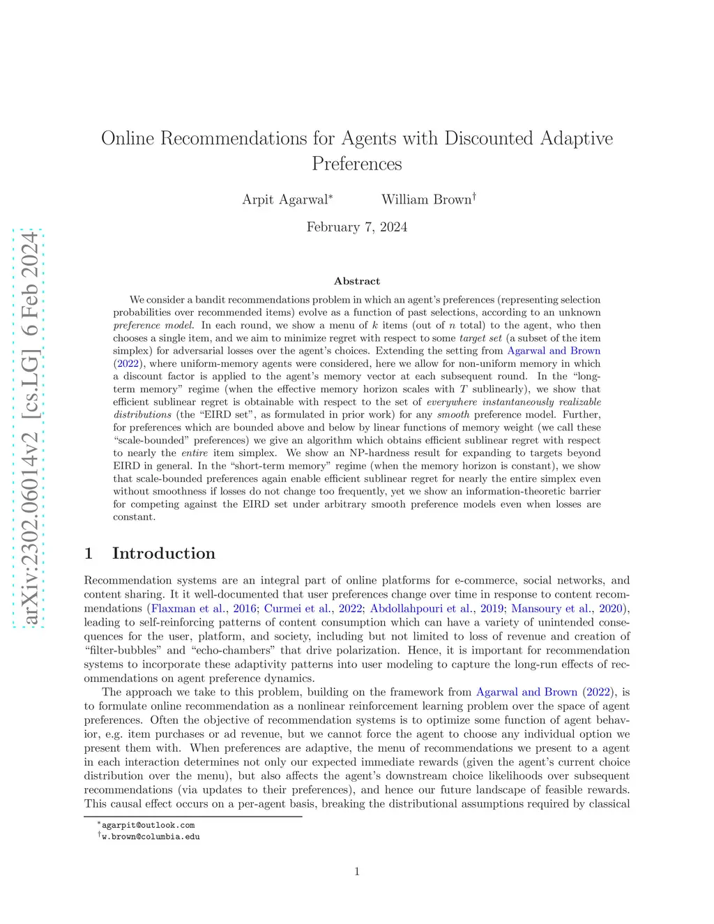 We consider a bandit recommendations problem in which an agent's preferences (representing selection probabilities over recommended items) evolve as a function of past selections, according to an unknown . In each round, we show a menu of items (out of total) to the agent, who then chooses a single item, and we aim to minimize regret with respect to some (a subset of the item simplex) for adversarial losses over the agent's choices. Extending the setting from Agarwal and Brown (2022), where uniform-memory agents were considered, here we allow for non-uniform memory in which a discount factor is applied to the agent's memory vector at each subsequent round. In the "long-term memory" regime (when the effective memory horizon scales with sublinearly), we show that efficient sublinear regret is obtainable with respect to the set of (the "EIRD set", as formulated in prior work) for any preference model. Further, for preferences which are bounded above and below by linear functions of memory weight (we call these "scale-bounded" preferences) we give an algorithm which obtains efficient sublinear regret with respect to nearly the item simplex. We show an NP-hardness result for expanding to targets beyond EIRD in general. In the "short-term memory" regime (when the memory horizon is constant), we show that scale-bounded preferences again enable efficient sublinear regret for nearly the entire simplex even without smoothness if losses do not change too frequently, yet we show an information-theoretic barrier for competing against the EIRD set under arbitrary smooth preference models even when losses are constant.