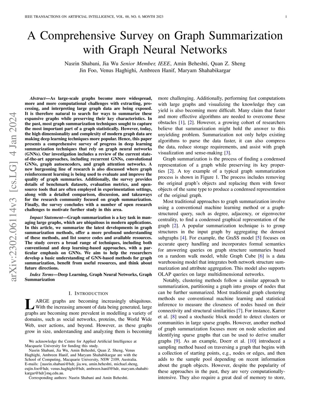 As large-scale graphs become more widespread, more and more computational challenges with extracting, processing, and interpreting large graph data are being exposed. It is therefore natural to search for ways to summarize these expansive graphs while preserving their key characteristics. In the past, most graph summarization techniques sought to capture the most important part of a graph statistically. However, today, the high dimensionality and complexity of modern graph data are making deep learning techniques more popular. Hence, this paper presents a comprehensive survey of progress in deep learning summarization techniques that rely on graph neural networks (GNNs). Our investigation includes a review of the current state-of-the-art approaches, including recurrent GNNs, convolutional GNNs, graph autoencoders, and graph attention networks. A new burgeoning line of research is also discussed where graph reinforcement learning is being used to evaluate and improve the quality of graph summaries. Additionally, the survey provides details of benchmark datasets, evaluation metrics, and open-source tools that are often employed in experimentation settings, along with a detailed comparison, discussion, and takeaways for the research community focused on graph summarization. Finally, the survey concludes with a number of open research challenges to motivate further study in this area.