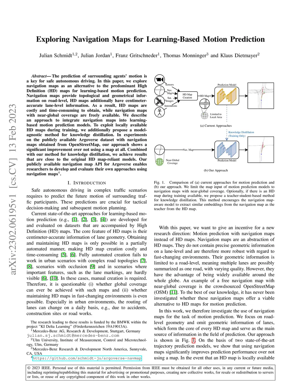 The prediction of surrounding agents' motion is a key for safe autonomous driving. In this paper, we explore navigation maps as an alternative to the predominant High Definition (HD) maps for learning-based motion prediction. Navigation maps provide topological and geometrical information on road-level, HD maps additionally have centimeter-accurate lane-level information. As a result, HD maps are costly and time-consuming to obtain, while navigation maps with near-global coverage are freely available. We describe an approach to integrate navigation maps into learning-based motion prediction models. To exploit locally available HD maps during training, we additionally propose a model-agnostic method for knowledge distillation. In experiments on the publicly available Argoverse dataset with navigation maps obtained from OpenStreetMap, our approach shows a significant improvement over not using a map at all. Combined with our method for knowledge distillation, we achieve results that are close to the original HD map-reliant models. Our publicly available navigation map API for Argoverse enables researchers to develop and evaluate their own approaches using navigation maps.
