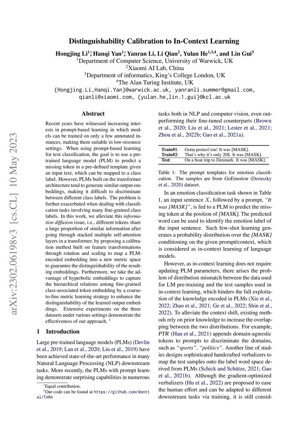 Recent years have witnessed increasing interests in prompt-based learning in which models can be trained on only a few annotated instances, making them suitable in low-resource settings. When using prompt-based learning for text classification, the goal is to use a pre-trained language model (PLM) to predict a missing token in a pre-defined template given an input text, which can be mapped to a class label. However, PLMs built on the transformer architecture tend to generate similar output embeddings, making it difficult to discriminate between different class labels. The problem is further exacerbated when dealing with classification tasks involving many fine-grained class labels. In this work, we alleviate this information diffusion issue, i.e., different tokens share a large proportion of similar information after going through stacked multiple self-attention layers in a transformer, by proposing a calibration method built on feature transformations through rotation and scaling to map a PLM-encoded embedding into a new metric space to guarantee the distinguishability of the resulting embeddings. Furthermore, we take the advantage of hyperbolic embeddings to capture the hierarchical relations among fine-grained class-associated token embedding by a coarse-to-fine metric learning strategy to enhance the distinguishability of the learned output embeddings. Extensive experiments on the three datasets under various settings demonstrate the effectiveness of our approach. Our code can be found at https://github.com/donttal/TARA.
