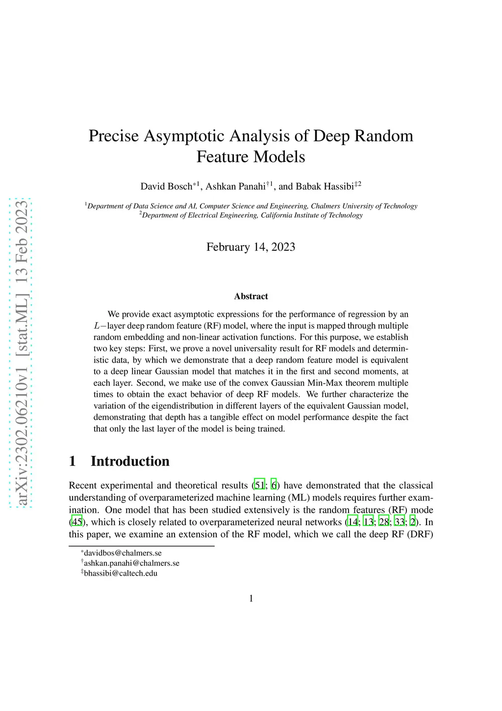 We provide exact asymptotic expressions for the performance of regression by an layer deep random feature (RF) model, where the input is mapped through multiple random embedding and non-linear activation functions. For this purpose, we establish two key steps: First, we prove a novel universality result for RF models and deterministic data, by which we demonstrate that a deep random feature model is equivalent to a deep linear Gaussian model that matches it in the first and second moments, at each layer. Second, we make use of the convex Gaussian Min-Max theorem multiple times to obtain the exact behavior of deep RF models. We further characterize the variation of the eigendistribution in different layers of the equivalent Gaussian model, demonstrating that depth has a tangible effect on model performance despite the fact that only the last layer of the model is being trained.