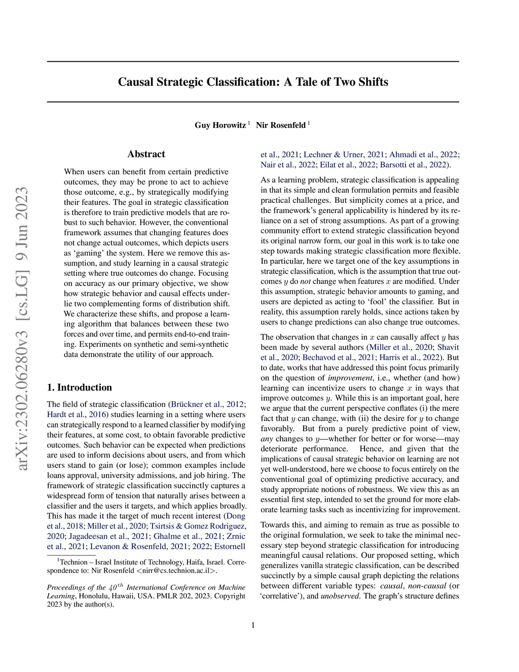 When users can benefit from certain predictive outcomes, they may be prone to act to achieve those outcome, e.g., by strategically modifying their features. The goal in strategic classification is therefore to train predictive models that are robust to such behavior. However, the conventional framework assumes that changing features does not change actual outcomes, which depicts users as "gaming" the system. Here we remove this assumption, and study learning in a causal strategic setting where true outcomes do change. Focusing on accuracy as our primary objective, we show how strategic behavior and causal effects underlie two complementing forms of distribution shift. We characterize these shifts, and propose a learning algorithm that balances between these two forces and over time, and permits end-to-end training. Experiments on synthetic and semi-synthetic data demonstrate the utility of our approach.