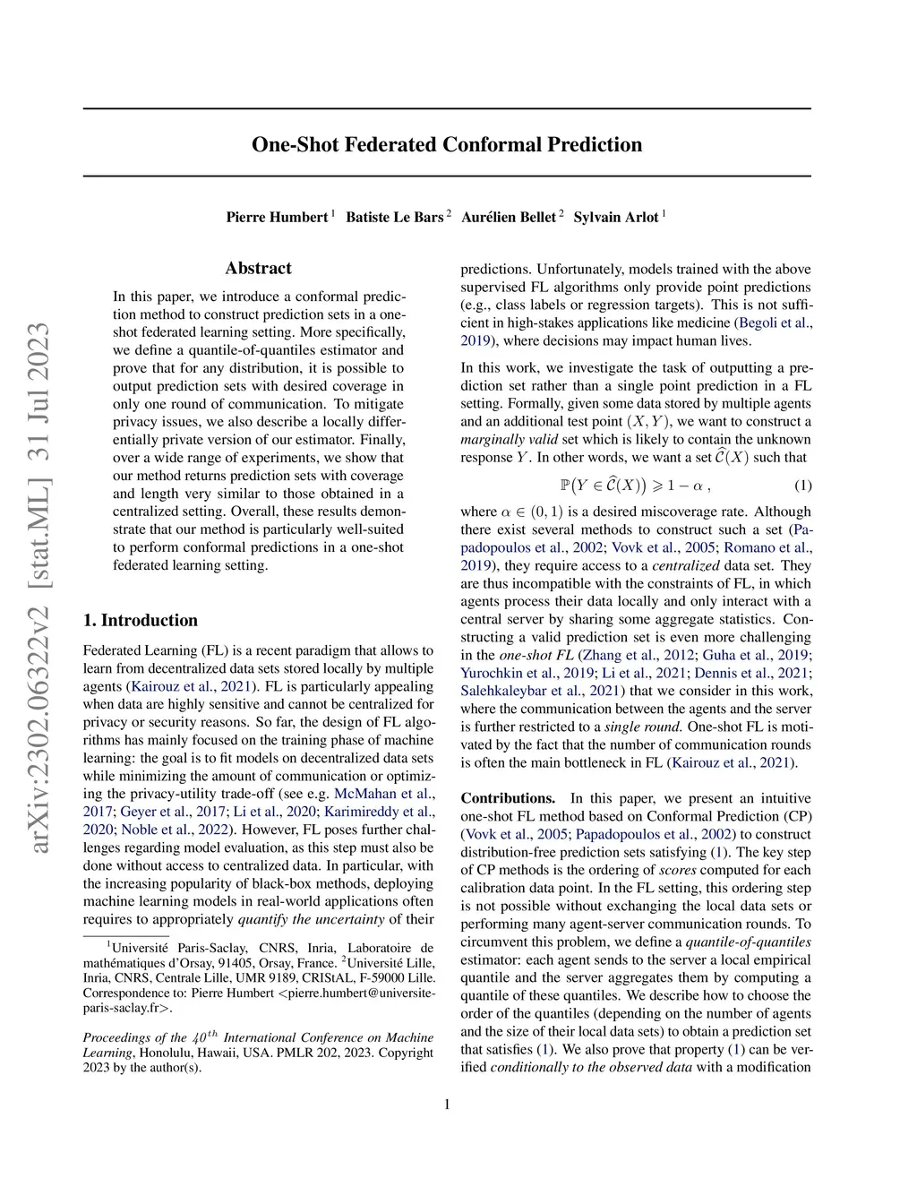 In this paper, we introduce a conformal prediction method to construct prediction sets in a oneshot federated learning setting. More specifically, we define a quantile-of-quantiles estimator and prove that for any distribution, it is possible to output prediction sets with desired coverage in only one round of communication. To mitigate privacy issues, we also describe a locally differentially private version of our estimator. Finally, over a wide range of experiments, we show that our method returns prediction sets with coverage and length very similar to those obtained in a centralized setting. Overall, these results demonstrate that our method is particularly well-suited to perform conformal predictions in a one-shot federated learning setting.