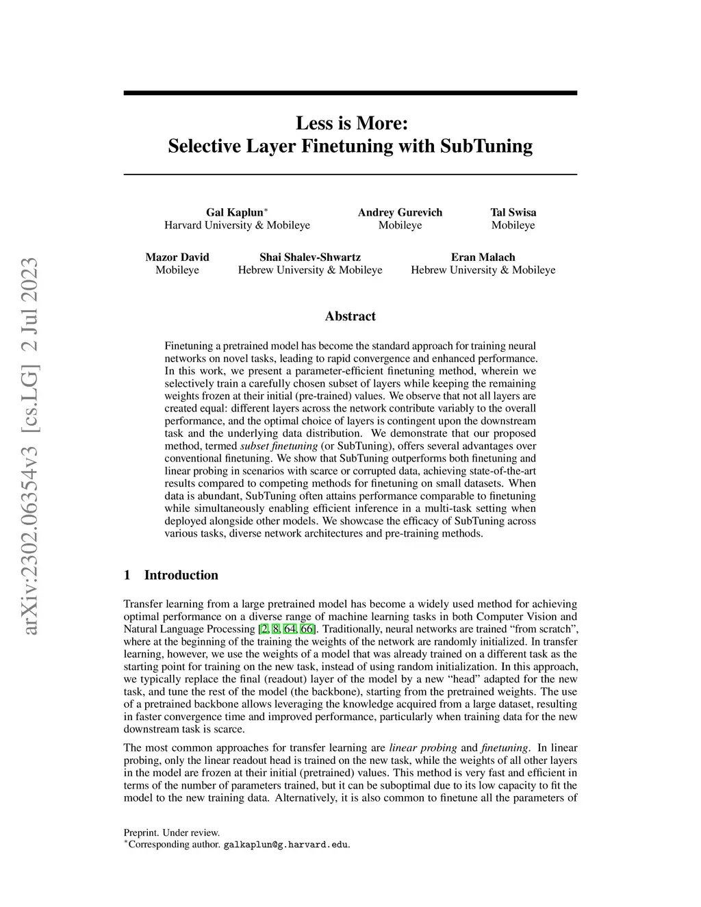 Finetuning a pretrained model has become a standard approach for training neural networks on novel tasks, resulting in fast convergence and improved performance. In this work, we study an alternative finetuning method, where instead of finetuning all the weights of the network, we only train a carefully chosen subset of layers, keeping the rest of the weights frozen at their initial (pretrained) values. We demonstrate that \emph{subset finetuning} (or SubTuning) often achieves accuracy comparable to full finetuning of the model, and even surpasses the performance of full finetuning when training data is scarce. Therefore, SubTuning allows deploying new tasks at minimal computational cost, while enjoying the benefits of finetuning the entire model. This yields a simple and effective method for multi-task learning, where different tasks do not interfere with one another, and yet share most of the resources at inference time. We demonstrate the efficiency of SubTuning across multiple tasks, using different network architectures and pretraining methods.