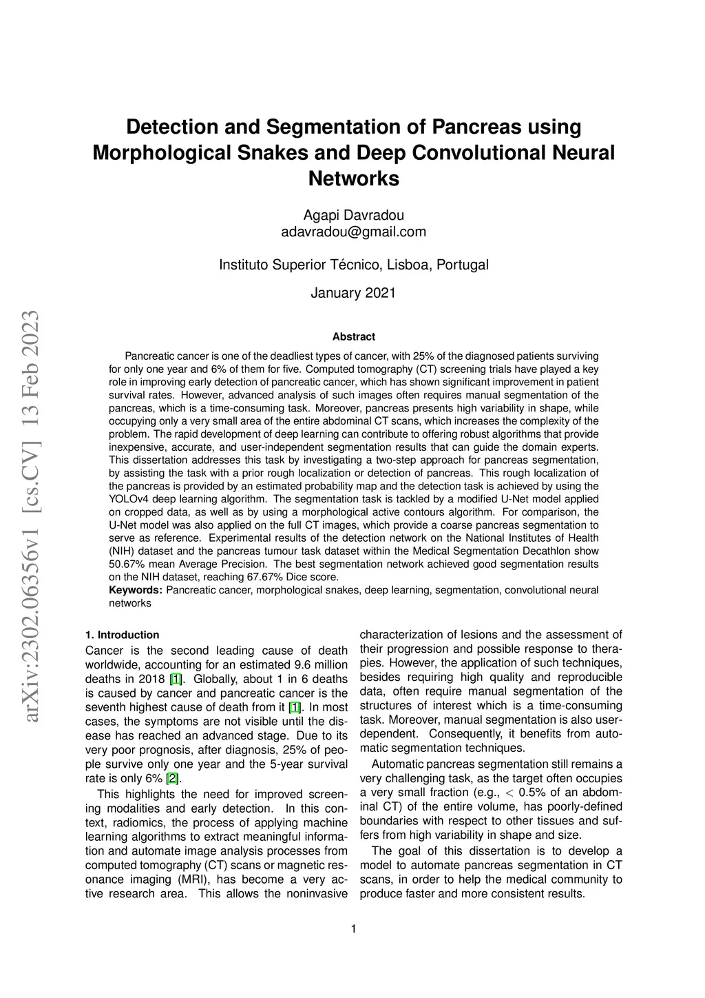 Pancreatic cancer is one of the deadliest types of cancer, with 25% of the diagnosed patients surviving for only one year and 6% of them for five. Computed tomography (CT) screening trials have played a key role in improving early detection of pancreatic cancer, which has shown significant improvement in patient survival rates. However, advanced analysis of such images often requires manual segmentation of the pancreas, which is a time-consuming task. Moreover, pancreas presents high variability in shape, while occupying only a very small area of the entire abdominal CT scans, which increases the complexity of the problem. The rapid development of deep learning can contribute to offering robust algorithms that provide inexpensive, accurate, and user-independent segmentation results that can guide the domain experts. This dissertation addresses this task by investigating a two-step approach for pancreas segmentation, by assisting the task with a prior rough localization or detection of pancreas. This rough localization of the pancreas is provided by an estimated probability map and the detection task is achieved by using the YOLOv4 deep learning algorithm. The segmentation task is tackled by a modified U-Net model applied on cropped data, as well as by using a morphological active contours algorithm. For comparison, the U-Net model was also applied on the full CT images, which provide a coarse pancreas segmentation to serve as reference. Experimental results of the detection network on the National Institutes of Health (NIH) dataset and the pancreas tumour task dataset within the Medical Segmentation Decathlon show 50.67% mean Average Precision. The best segmentation network achieved good segmentation results on the NIH dataset, reaching 67.67% Dice score.