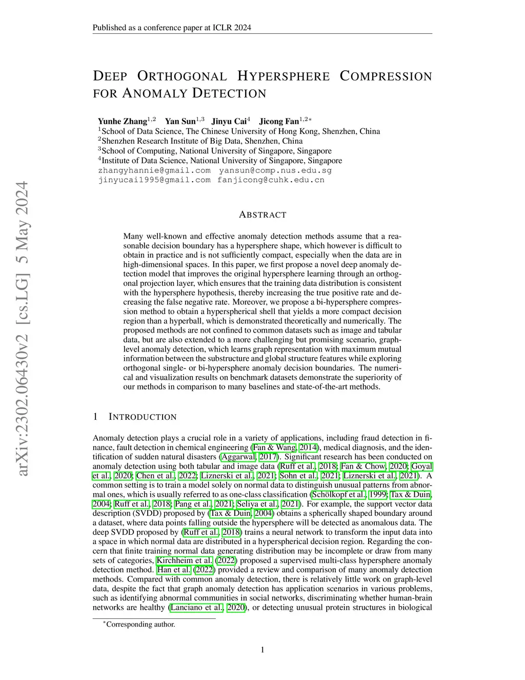Many well-known and effective anomaly detection methods assume that a reasonable decision boundary has a hypersphere shape, which however is difficult to obtain in practice and is not sufficiently compact, especially when the data are in high-dimensional spaces. In this paper, we first propose a novel deep anomaly detection model that improves the original hypersphere learning through an orthogonal projection layer, which ensures that the training data distribution is consistent with the hypersphere hypothesis, thereby increasing the true positive rate and decreasing the false negative rate. Moreover, we propose a bi-hypersphere compression method to obtain a hyperspherical shell that yields a more compact decision region than a hyperball, which is demonstrated theoretically and numerically. The proposed methods are not confined to common datasets such as image and tabular data, but are also extended to a more challenging but promising scenario, graph-level anomaly detection, which learns graph representation with maximum mutual information between the substructure and global structure features while exploring orthogonal single- or bi-hypersphere anomaly decision boundaries. The numerical and visualization results on benchmark datasets demonstrate the superiority of our methods in comparison to many baselines and state-of-the-art methods.