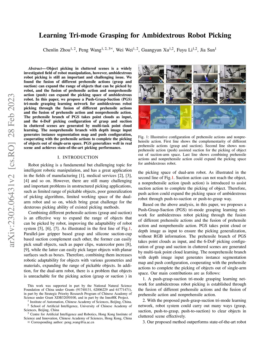 Object picking in cluttered scenes is a widely investigated field of robot manipulation, however, ambidextrous robot picking is still an important and challenging issue. We found the fusion of different prehensile actions (grasp and suction) can expand the range of objects that can be picked by robot, and the fusion of prehensile action and nonprehensile action (push) can expand the picking space of ambidextrous robot. In this paper, we propose a Push-Grasp-Suction (PGS) tri-mode grasping learning network for ambidextrous robot picking through the fusion of different prehensile actions and the fusion of prehensile action and nonprehensile aciton. The prehensile branch of PGS takes point clouds as input, and the 6-DoF picking configuration of grasp and suction in cluttered scenes are generated by multi-task point cloud learning. The nonprehensile branch with depth image input generates instance segmentation map and push configuration, cooperating with the prehensile actions to complete the picking of objects out of single-arm space. PGS generalizes well in real scene and achieves state-of-the-art picking performance.
