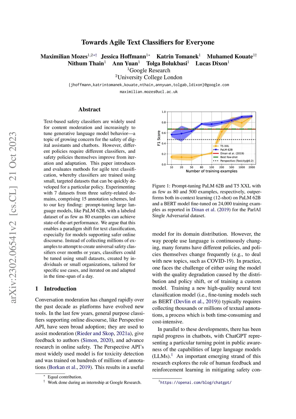 Text-based safety classifiers are widely used for content moderation and increasingly to tune generative language model behavior - a topic of growing concern for the safety of digital assistants and chatbots. However, different policies require different classifiers, and safety policies themselves improve from iteration and adaptation. This paper introduces and evaluates methods for agile text classification, whereby classifiers are trained using small, targeted datasets that can be quickly developed for a particular policy. Experimenting with 7 datasets from three safety-related domains, comprising 15 annotation schemes, led to our key finding: prompt-tuning large language models, like PaLM 62B, with a labeled dataset of as few as 80 examples can achieve state-of-the-art performance. We argue that this enables a paradigm shift for text classification, especially for models supporting safer online discourse. Instead of collecting millions of examples to attempt to create universal safety classifiers over months or years, classifiers could be tuned using small datasets, created by individuals or small organizations, tailored for specific use cases, and iterated on and adapted in the time-span of a day.
