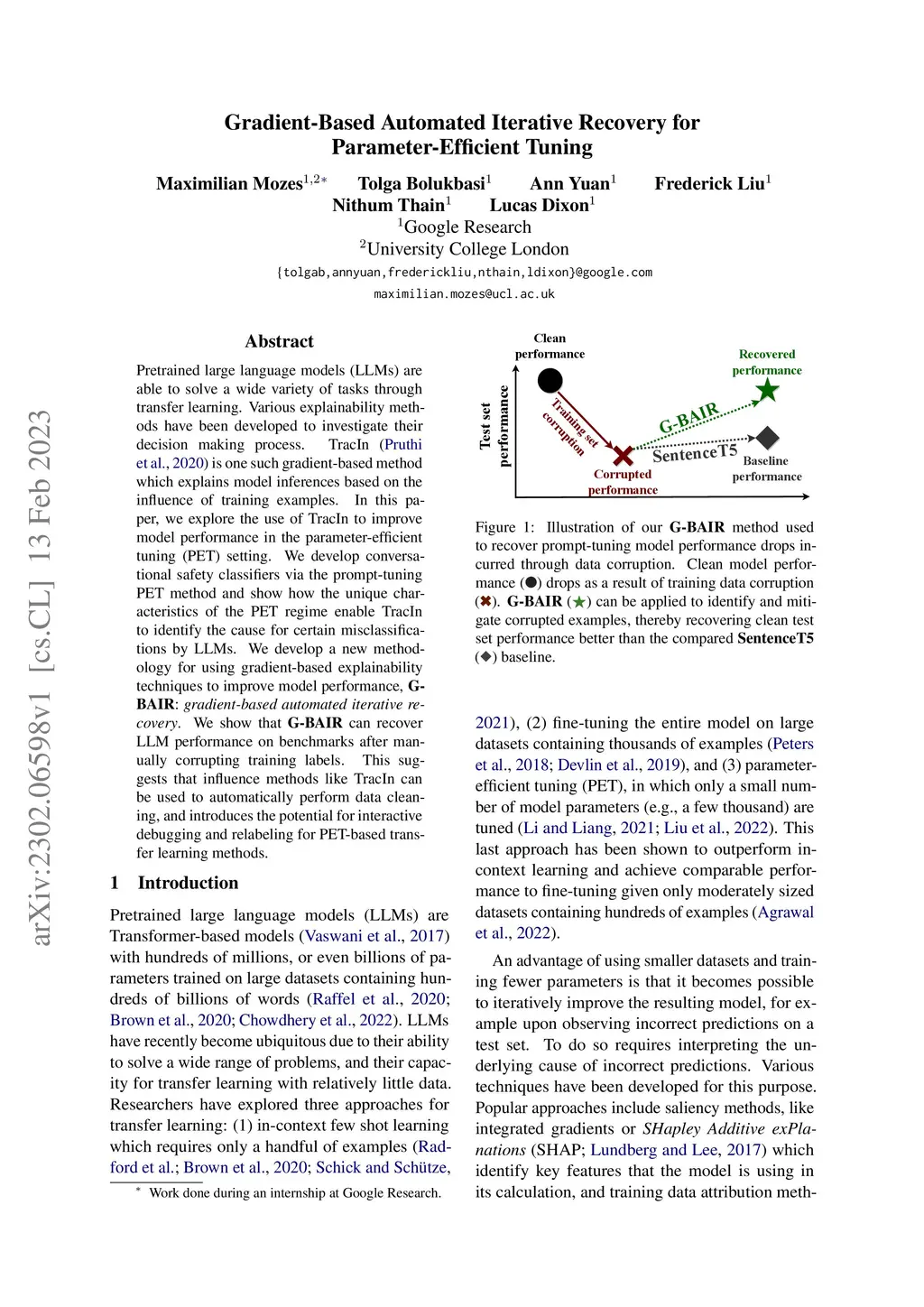 Pretrained large language models (LLMs) are able to solve a wide variety of tasks through transfer learning. Various explainability methods have been developed to investigate their decision making process. TracIn (Pruthi et al., 2020) is one such gradient-based method which explains model inferences based on the influence of training examples. In this paper, we explore the use of TracIn to improve model performance in the parameter-efficient tuning (PET) setting. We develop conversational safety classifiers via the prompt-tuning PET method and show how the unique characteristics of the PET regime enable TracIn to identify the cause for certain misclassifications by LLMs. We develop a new methodology for using gradient-based explainability techniques to improve model performance, G-BAIR: gradient-based automated iterative recovery. We show that G-BAIR can recover LLM performance on benchmarks after manually corrupting training labels. This suggests that influence methods like TracIn can be used to automatically perform data cleaning, and introduces the potential for interactive debugging and relabeling for PET-based transfer learning methods.