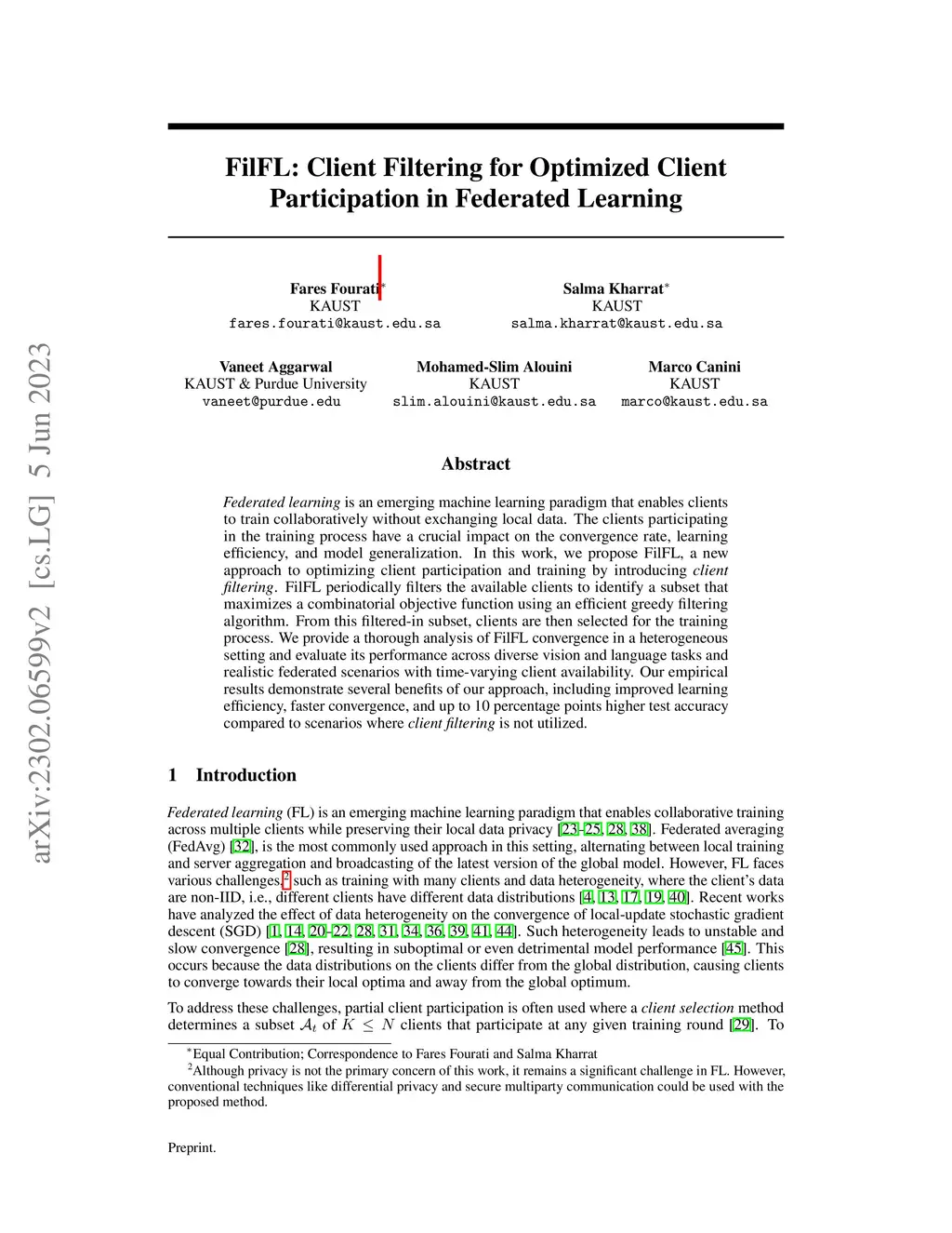 Federated learning is an emerging machine learning paradigm that enables clients to train collaboratively without exchanging local data. The clients participating in the training process have a crucial impact on the convergence rate, learning efficiency, and model generalization. In this work, we propose FilFL, a new approach to optimizing client participation and training by introducing client filtering. FilFL periodically filters the available clients to identify a subset that maximizes a combinatorial objective function using an efficient greedy filtering algorithm. From this filtered-in subset, clients are then selected for the training process. We provide a thorough analysis of FilFL convergence in a heterogeneous setting and evaluate its performance across diverse vision and language tasks and realistic federated scenarios with time-varying client availability. Our empirical results demonstrate several benefits of our approach, including improved learning efficiency, faster convergence, and up to 10 percentage points higher test accuracy compared to scenarios where client filtering is not utilized.
