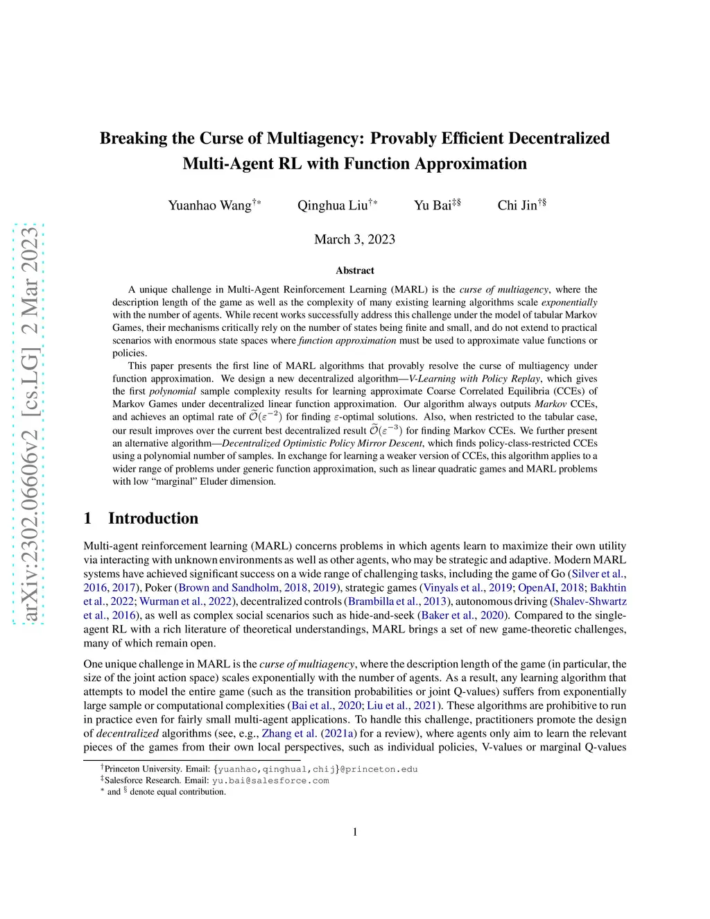 A unique challenge in Multi-Agent Reinforcement Learning (MARL) is the curse of multiagency, where the description length of the game as well as the complexity of many existing learning algorithms scale exponentially with the number of agents. While recent works successfully address this challenge under the model of tabular Markov Games, their mechanisms critically rely on the number of states being finite and small, and do not extend to practical scenarios with enormous state spaces where function approximation must be used to approximate value functions or policies. This paper presents the first line of MARL algorithms that provably resolve the curse of multiagency under function approximation. We design a new decentralized algorithm -- V-Learning with Policy Replay, which gives the first polynomial sample complexity results for learning approximate Coarse Correlated Equilibria (CCEs) of Markov Games under decentralized linear function approximation. Our algorithm always outputs Markov CCEs, and achieves an optimal rate of for finding -optimal solutions. Also, when restricted to the tabular case, our result improves over the current best decentralized result for finding Markov CCEs. We further present an alternative algorithm -- Decentralized Optimistic Policy Mirror Descent, which finds policy-class-restricted CCEs using a polynomial number of samples. In exchange for learning a weaker version of CCEs, this algorithm applies to a wider range of problems under generic function approximation, such as linear quadratic games and MARL problems with low ''marginal'' Eluder dimension.