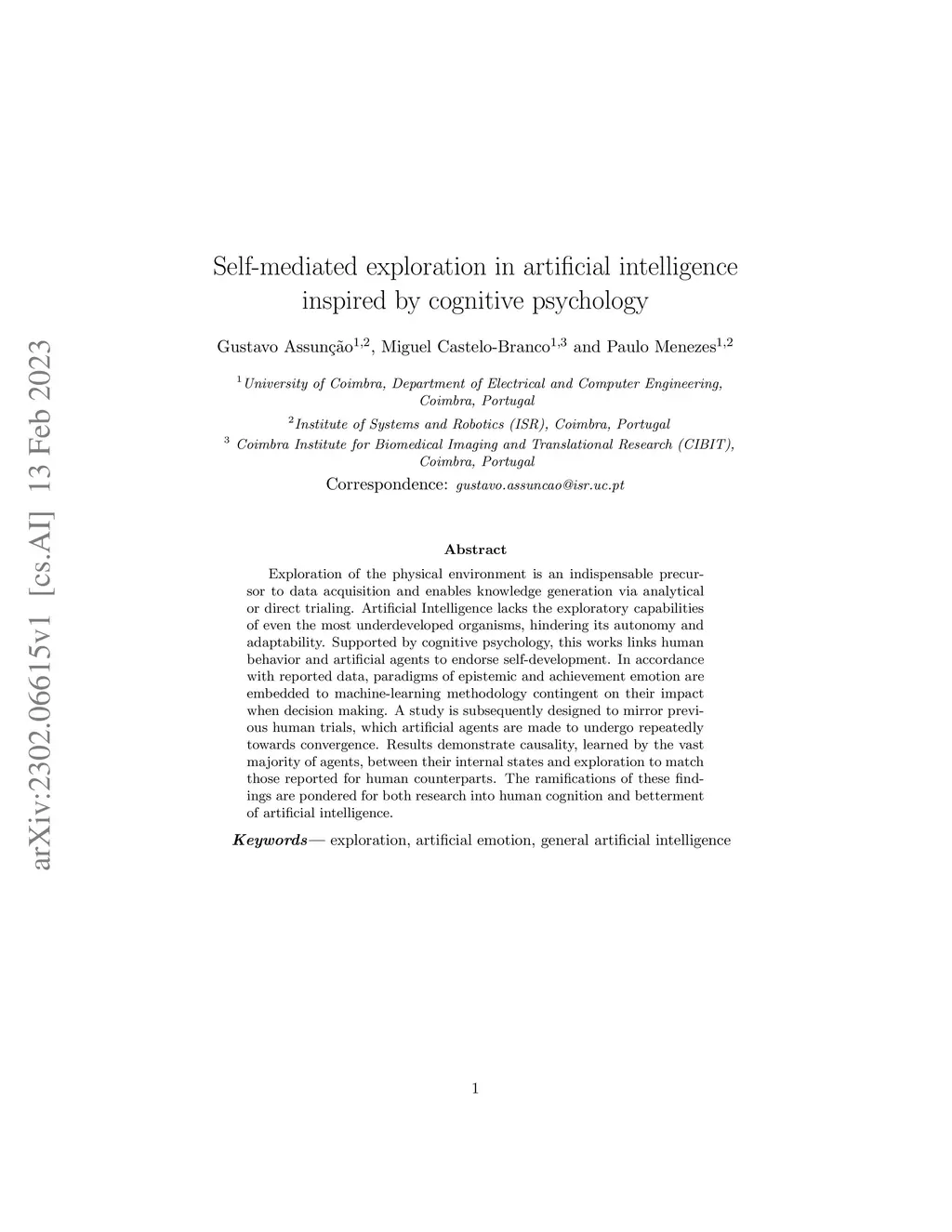 Background: Exploration of the physical environment is an indispensable precursor to information acquisition and knowledge consolidation for living organisms. Yet, current artificial intelligence models lack these autonomy capabilities during training, hindering their adaptability. This work proposes a learning framework for artificial agents to obtain an intrinsic exploratory drive, based on epistemic and achievement emotions triggered during data observation. Methods: This study proposes a dual-module reinforcement framework, where data analysis scores dictate pride or surprise, in accordance with psychological studies on humans. A correlation between these states and exploration is then optimized for agents to meet their learning goals. Results: Causal relationships between states and exploration are demonstrated by the majority of agents. A 15.4\% mean increase is noted for surprise, with a 2.8\% mean decrease for pride. Resulting correlations of and are obtained, mirroring previously reported human behavior. Conclusions: These findings lead to the conclusion that bio-inspiration for AI development can be of great use. This can incur benefits typically found in living beings, such as autonomy. Further, it empirically shows how AI methodologies can corroborate human behavioral findings, showcasing major interdisciplinary importance. Ramifications are discussed.