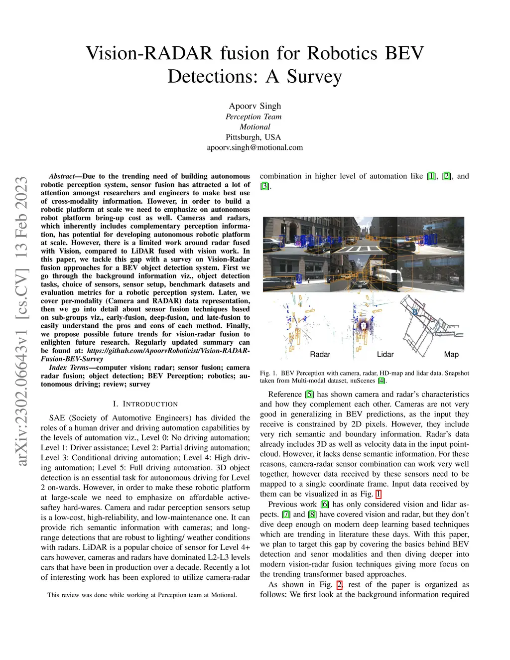 Due to the trending need of building autonomous robotic perception system, sensor fusion has attracted a lot of attention amongst researchers and engineers to make best use of cross-modality information. However, in order to build a robotic platform at scale we need to emphasize on autonomous robot platform bring-up cost as well. Cameras and radars, which inherently includes complementary perception information, has potential for developing autonomous robotic platform at scale. However, there is a limited work around radar fused with Vision, compared to LiDAR fused with vision work. In this paper, we tackle this gap with a survey on Vision-Radar fusion approaches for a BEV object detection system. First we go through the background information viz., object detection tasks, choice of sensors, sensor setup, benchmark datasets and evaluation metrics for a robotic perception system. Later, we cover per-modality (Camera and RADAR) data representation, then we go into detail about sensor fusion techniques based on sub-groups viz., early-fusion, deep-fusion, and late-fusion to easily understand the pros and cons of each method. Finally, we propose possible future trends for vision-radar fusion to enlighten future research. Regularly updated summary can be found at: https://github.com/ApoorvRoboticist/Vision-RADAR-Fusion-BEV-Survey