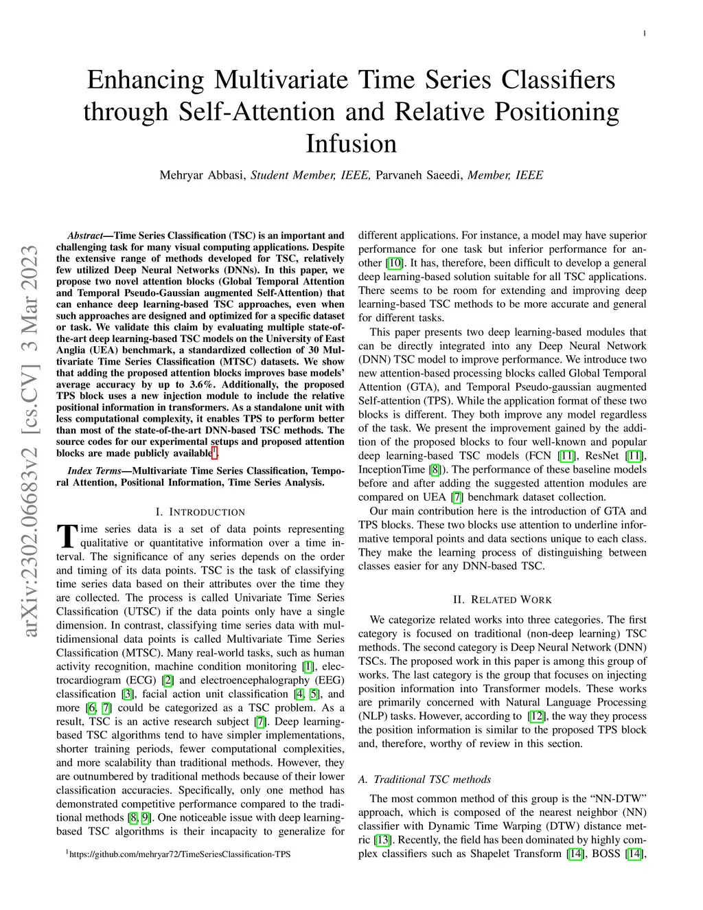Time Series Classification (TSC) is an important and challenging task for many visual computing applications. Despite the extensive range of methods developed for TSC, relatively few utilized Deep Neural Networks (DNNs). In this paper, we propose two novel attention blocks (Global Temporal Attention and Temporal Pseudo-Gaussian augmented Self-Attention) that can enhance deep learning-based TSC approaches, even when such approaches are designed and optimized for a specific dataset or task. We validate this claim by evaluating multiple state-of-the-art deep learning-based TSC models on the University of East Anglia (UEA) benchmark, a standardized collection of 30 Multivariate Time Series Classification (MTSC) datasets. We show that adding the proposed attention blocks improves base models' average accuracy by up to 3.6%. Additionally, the proposed TPS block uses a new injection module to include the relative positional information in transformers. As a standalone unit with less computational complexity, it enables TPS to perform better than most of the state-of-the-art DNN-based TSC methods. The source codes for our experimental setups and proposed attention blocks are made publicly available.