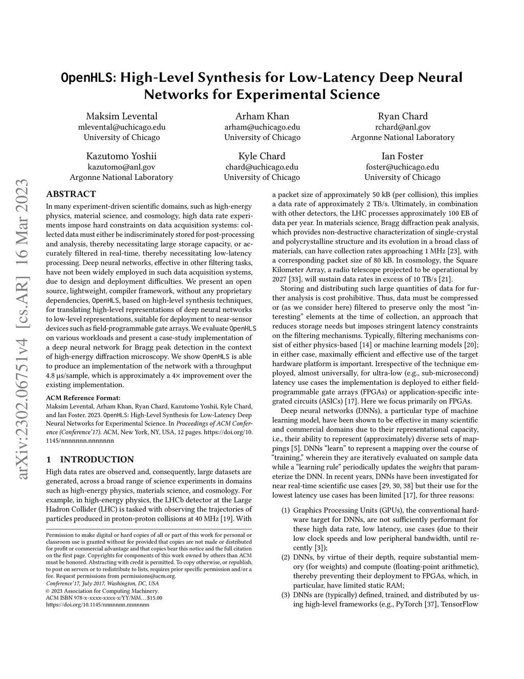 In many experiment-driven scientific domains, such as high-energy physics, material science, and cosmology, high data rate experiments impose hard constraints on data acquisition systems: collected data must either be indiscriminately stored for post-processing and analysis, thereby necessitating large storage capacity, or accurately filtered in real-time, thereby necessitating low-latency processing. Deep neural networks, effective in other filtering tasks, have not been widely employed in such data acquisition systems, due to design and deployment difficulties. We present an open source, lightweight, compiler framework, without any proprietary dependencies, OpenHLS, based on high-level synthesis techniques, for translating high-level representations of deep neural networks to low-level representations, suitable for deployment to near-sensor devices such as field-programmable gate arrays. We evaluate OpenHLS on various workloads and present a case-study implementation of a deep neural network for Bragg peak detection in the context of high-energy diffraction microscopy. We show OpenHLS is able to produce an implementation of the network with a throughput 4.8 s/sample, which is approximately a 4 improvement over the existing implementation