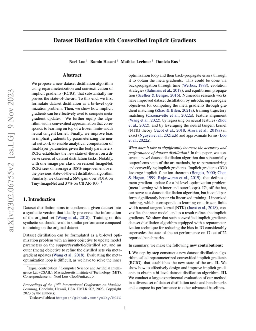 We propose a new dataset distillation algorithm using reparameterization and convexification of implicit gradients (RCIG), that substantially improves the state-of-the-art. To this end, we first formulate dataset distillation as a bi-level optimization problem. Then, we show how implicit gradients can be effectively used to compute meta-gradient updates. We further equip the algorithm with a convexified approximation that corresponds to learning on top of a frozen finite-width neural tangent kernel. Finally, we improve bias in implicit gradients by parameterizing the neural network to enable analytical computation of final-layer parameters given the body parameters. RCIG establishes the new state-of-the-art on a diverse series of dataset distillation tasks. Notably, with one image per class, on resized ImageNet, RCIG sees on average a 108\% improvement over the previous state-of-the-art distillation algorithm. Similarly, we observed a 66\% gain over SOTA on Tiny-ImageNet and 37\% on CIFAR-100.