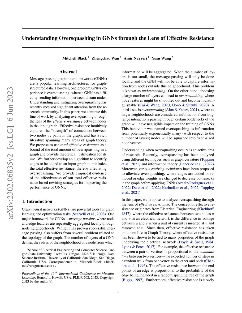 Message passing graph neural networks (GNNs) are a popular learning architectures for graph-structured data. However, one problem GNNs experience is oversquashing, where a GNN has difficulty sending information between distant nodes. Understanding and mitigating oversquashing has recently received significant attention from the research community. In this paper, we continue this line of work by analyzing oversquashing through the lens of the effective resistance between nodes in the input graph. Effective resistance intuitively captures the ``strength'' of connection between two nodes by paths in the graph, and has a rich literature spanning many areas of graph theory. We propose to use total effective resistance as a bound of the total amount of oversquashing in a graph and provide theoretical justification for its use. We further develop an algorithm to identify edges to be added to an input graph to minimize the total effective resistance, thereby alleviating oversquashing. We provide empirical evidence of the effectiveness of our total effective resistance based rewiring strategies for improving the performance of GNNs.