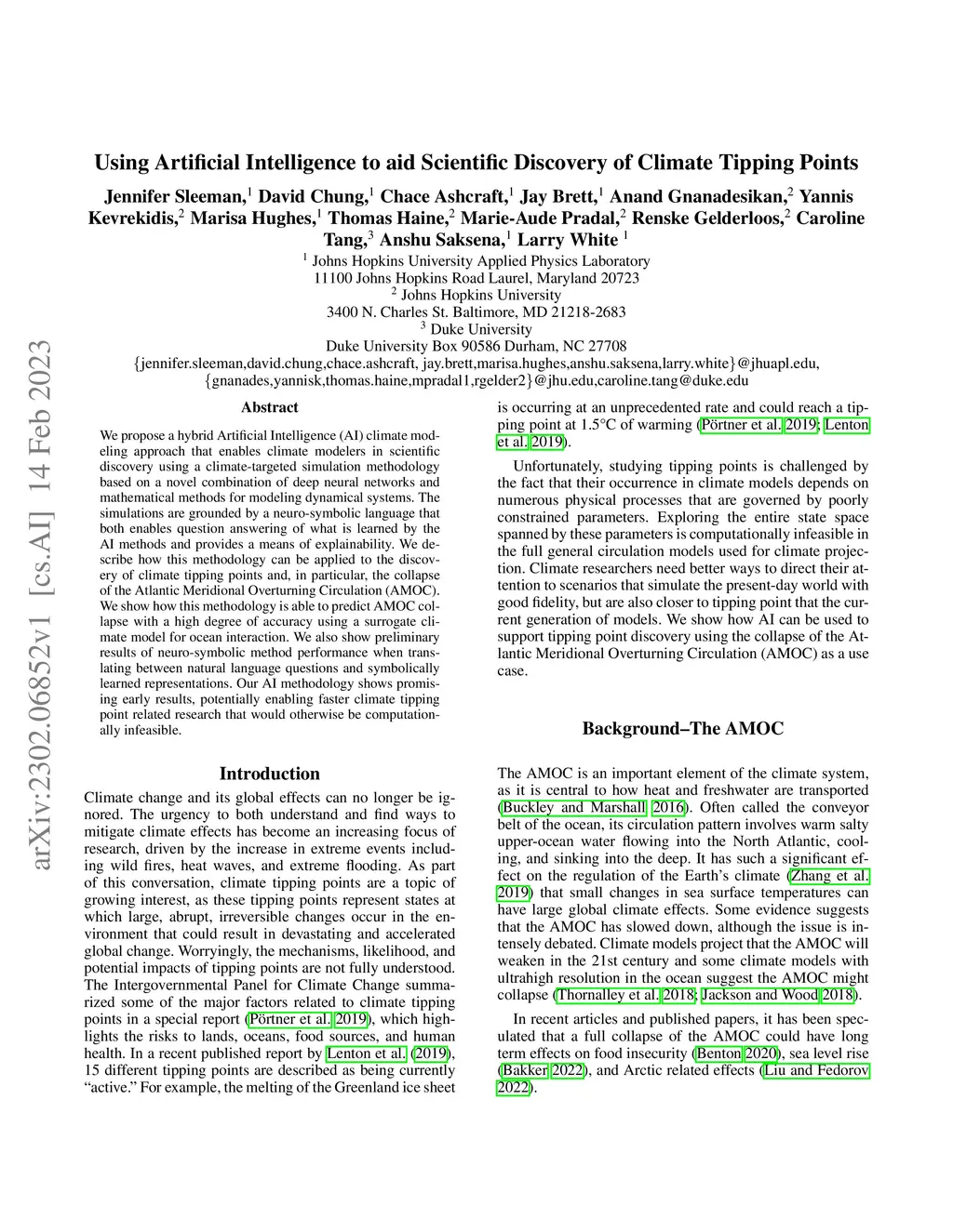 We propose a hybrid Artificial Intelligence (AI) climate modeling approach that enables climate modelers in scientific discovery using a climate-targeted simulation methodology based on a novel combination of deep neural networks and mathematical methods for modeling dynamical systems. The simulations are grounded by a neuro-symbolic language that both enables question answering of what is learned by the AI methods and provides a means of explainability. We describe how this methodology can be applied to the discovery of climate tipping points and, in particular, the collapse of the Atlantic Meridional Overturning Circulation (AMOC). We show how this methodology is able to predict AMOC collapse with a high degree of accuracy using a surrogate climate model for ocean interaction. We also show preliminary results of neuro-symbolic method performance when translating between natural language questions and symbolically learned representations. Our AI methodology shows promising early results, potentially enabling faster climate tipping point related research that would otherwise be computationally infeasible.
