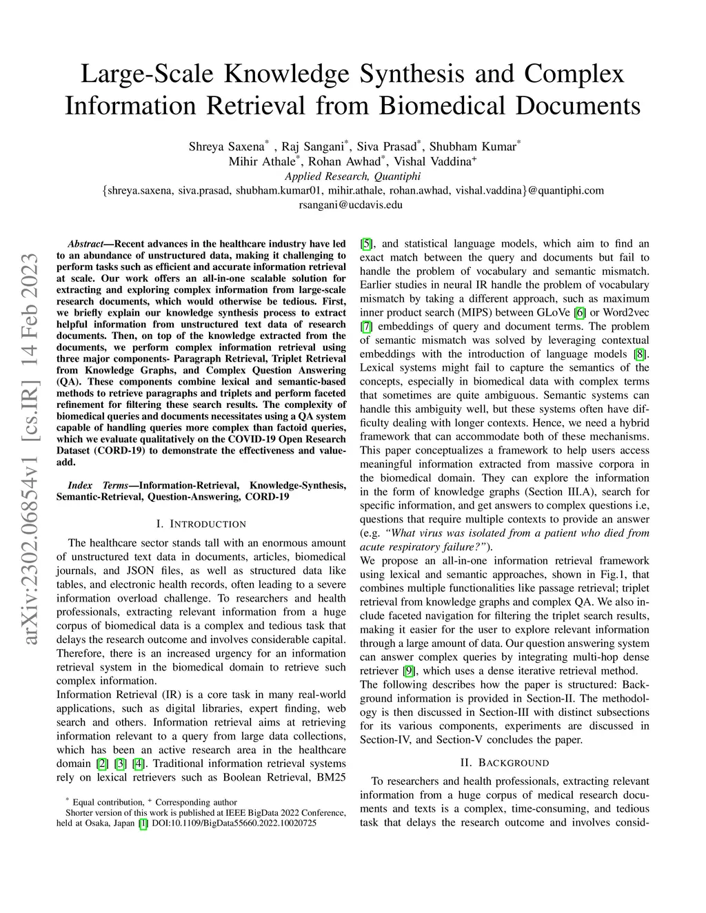 Recent advances in the healthcare industry have led to an abundance of unstructured data, making it challenging to perform tasks such as efficient and accurate information retrieval at scale. Our work offers an all-in-one scalable solution for extracting and exploring complex information from large-scale research documents, which would otherwise be tedious. First, we briefly explain our knowledge synthesis process to extract helpful information from unstructured text data of research documents. Then, on top of the knowledge extracted from the documents, we perform complex information retrieval using three major components- Paragraph Retrieval, Triplet Retrieval from Knowledge Graphs, and Complex Question Answering (QA). These components combine lexical and semantic-based methods to retrieve paragraphs and triplets and perform faceted refinement for filtering these search results. The complexity of biomedical queries and documents necessitates using a QA system capable of handling queries more complex than factoid queries, which we evaluate qualitatively on the COVID-19 Open Research Dataset (CORD-19) to demonstrate the effectiveness and value-add.