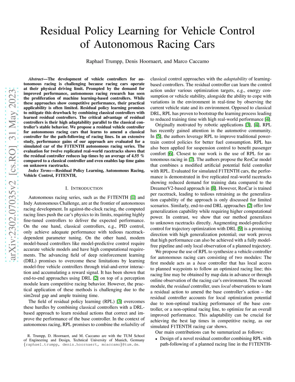 Residual Policy Learning for Vehicle Control of Autonomous Racing Cars