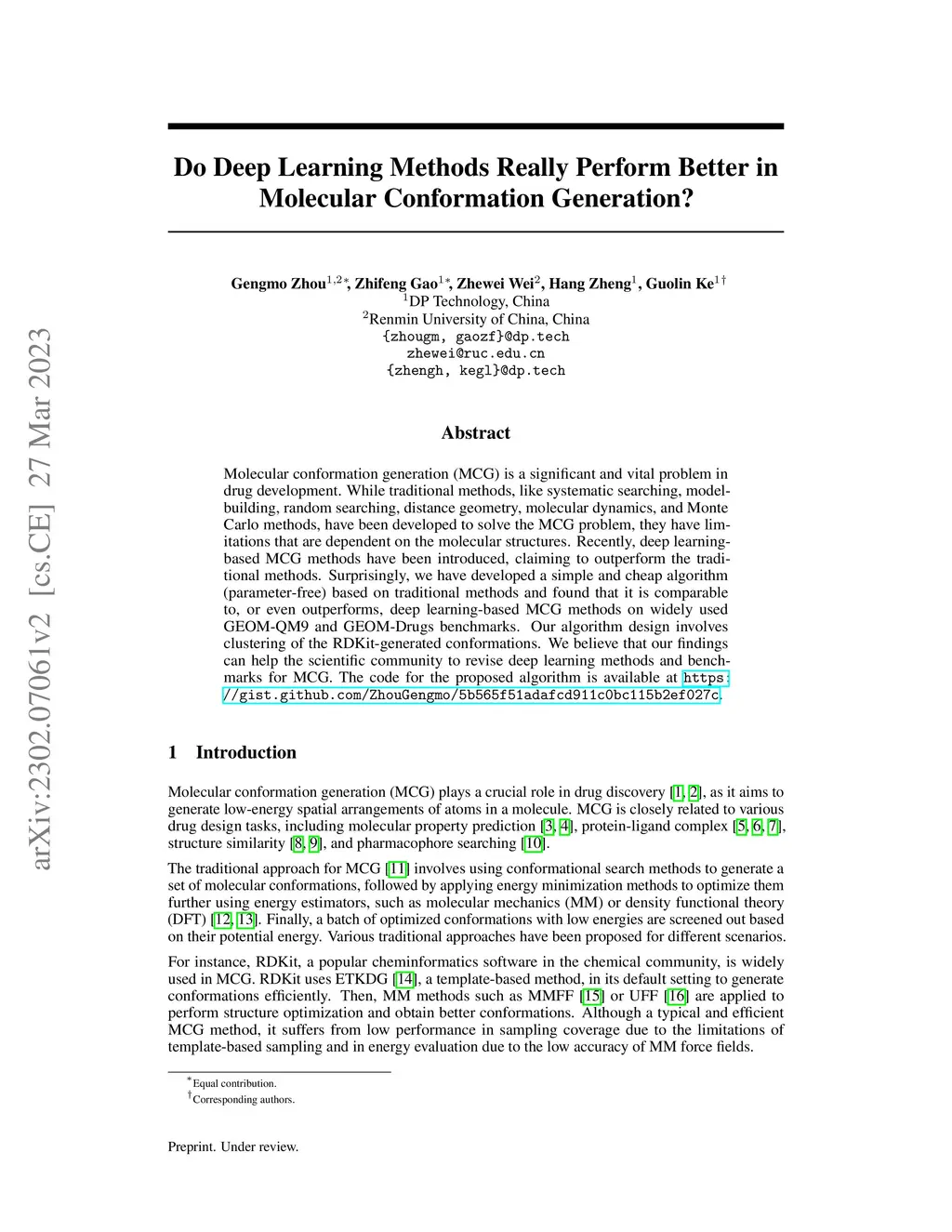 Molecular conformation generation (MCG) is a fundamental and important problem in drug discovery. Many traditional methods have been developed to solve the MCG problem, such as systematic searching, model-building, random searching, distance geometry, molecular dynamics, Monte Carlo methods, etc. However, they have some limitations depending on the molecular structures. Recently, there are plenty of deep learning based MCG methods, which claim they largely outperform the traditional methods. However, to our surprise, we design a simple and cheap algorithm (parameter-free) based on the traditional methods and find it is comparable to or even outperforms deep learning based MCG methods in the widely used GEOM-QM9 and GEOM-Drugs benchmarks. In particular, our design algorithm is simply the clustering of the RDKIT-generated conformations. We hope our findings can help the community to revise the deep learning methods for MCG. The code of the proposed algorithm could be found at https://gist.github.com/ZhouGengmo/5b565f51adafcd911c0bc115b2ef027c.