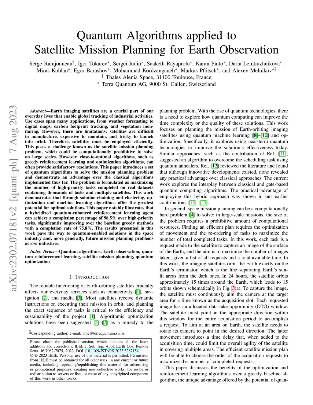 Earth imaging satellites are a crucial part of our everyday lives that enable global tracking of industrial activities. Use cases span many applications, from weather forecasting to digital maps, carbon footprint tracking, and vegetation monitoring. However, there are limitations; satellites are difficult to manufacture, expensive to maintain, and tricky to launch into orbit. Therefore, satellites must be employed efficiently. This poses a challenge known as the satellite mission planning problem, which could be computationally prohibitive to solve on large scales. However, close-to-optimal algorithms, such as greedy reinforcement learning and optimization algorithms, can often provide satisfactory resolutions. This paper introduces a set of quantum algorithms to solve the mission planning problem and demonstrate an advantage over the classical algorithms implemented thus far. The problem is formulated as maximizing the number of high-priority tasks completed on real datasets containing thousands of tasks and multiple satellites. This work demonstrates that through solution-chaining and clustering, optimization and machine learning algorithms offer the greatest potential for optimal solutions. This paper notably illustrates that a hybridized quantum-enhanced reinforcement learning agent can achieve a completion percentage of 98.5% over high-priority tasks, significantly improving over the baseline greedy methods with a completion rate of 75.8%. The results presented in this work pave the way to quantum-enabled solutions in the space industry and, more generally, future mission planning problems across industries.