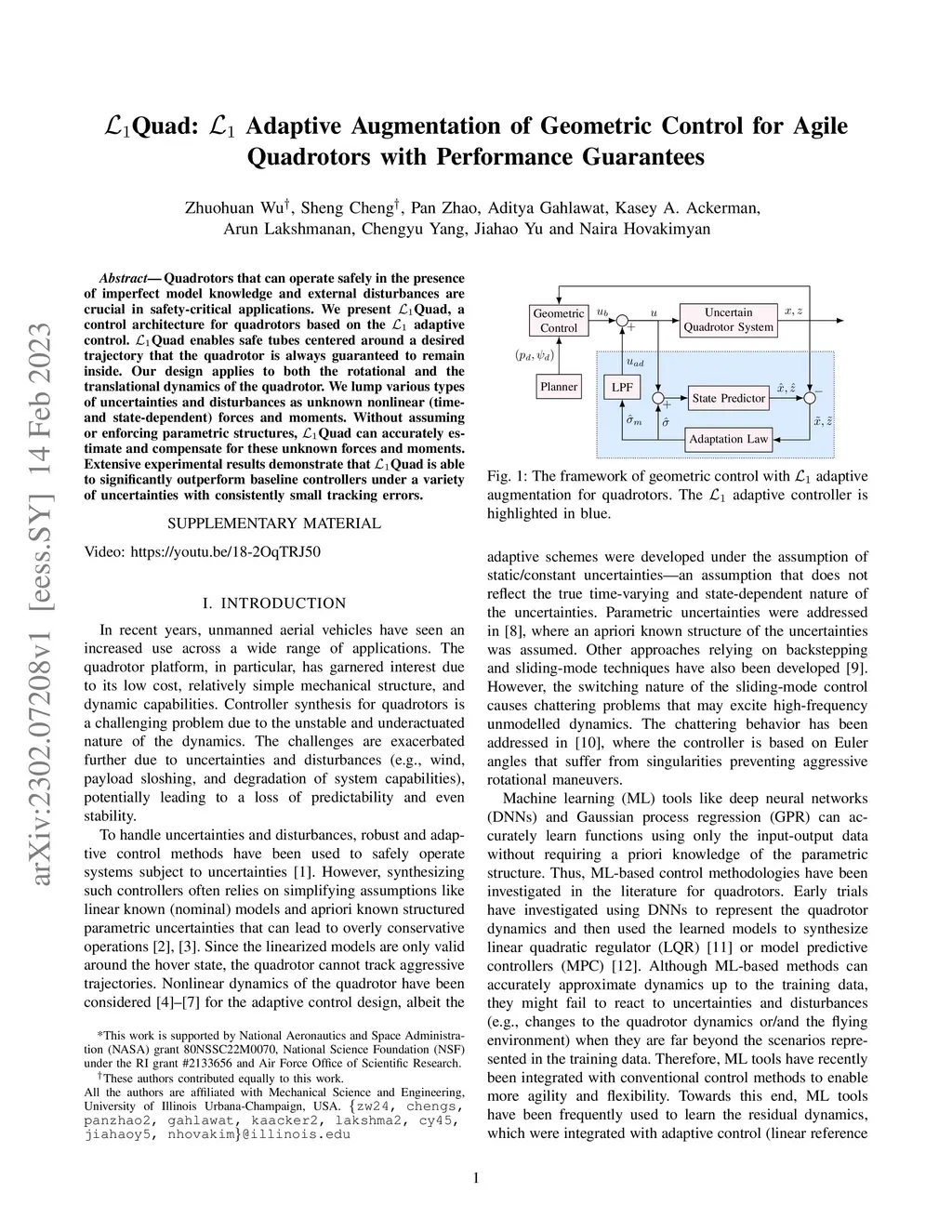 Quadrotors that can operate safely in the presence of imperfect model knowledge and external disturbances are crucial in safety-critical applications. We present L1Quad, a control architecture for quadrotors based on the L1 adaptive control. L1Quad enables safe tubes centered around a desired trajectory that the quadrotor is always guaranteed to remain inside. Our design applies to both the rotational and the translational dynamics of the quadrotor. We lump various types of uncertainties and disturbances as unknown nonlinear (time- and state-dependent) forces and moments. Without assuming or enforcing parametric structures, L1Quad can accurately estimate and compensate for these unknown forces and moments. Extensive experimental results demonstrate that L1Quad is able to significantly outperform baseline controllers under a variety of uncertainties with consistently small tracking errors.