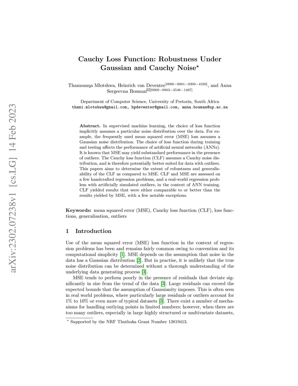 In supervised machine learning, the choice of loss function implicitly assumes a particular noise distribution over the data. For example, the frequently used mean squared error (MSE) loss assumes a Gaussian noise distribution. The choice of loss function during training and testing affects the performance of artificial neural networks (ANNs). It is known that MSE may yield substandard performance in the presence of outliers. The Cauchy loss function (CLF) assumes a Cauchy noise distribution, and is therefore potentially better suited for data with outliers. This papers aims to determine the extent of robustness and generalisability of the CLF as compared to MSE. CLF and MSE are assessed on a few handcrafted regression problems, and a real-world regression problem with artificially simulated outliers, in the context of ANN training. CLF yielded results that were either comparable to or better than the results yielded by MSE, with a few notable exceptions.