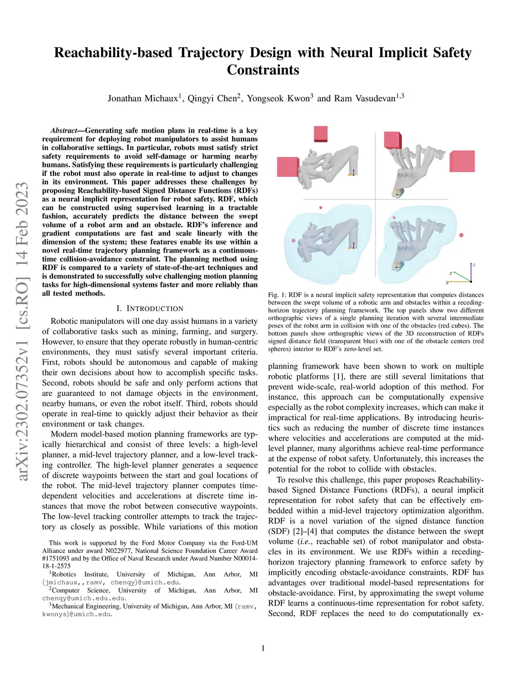 Generating safe motion plans in real-time is a key requirement for deploying robot manipulators to assist humans in collaborative settings. In particular, robots must satisfy strict safety requirements to avoid self-damage or harming nearby humans. Satisfying these requirements is particularly challenging if the robot must also operate in real-time to adjust to changes in its environment.This paper addresses these challenges by proposing Reachability-based Signed Distance Functions (RDFs) as a neural implicit representation for robot safety. RDF, which can be constructed using supervised learning in a tractable fashion, accurately predicts the distance between the swept volume of a robot arm and an obstacle. RDF's inference and gradient computations are fast and scale linearly with the dimension of the system; these features enable its use within a novel real-time trajectory planning framework as a continuous-time collision-avoidance constraint. The planning method using RDF is compared to a variety of state-of-the-art techniques and is demonstrated to successfully solve challenging motion planning tasks for high-dimensional systems faster and more reliably than all tested methods.