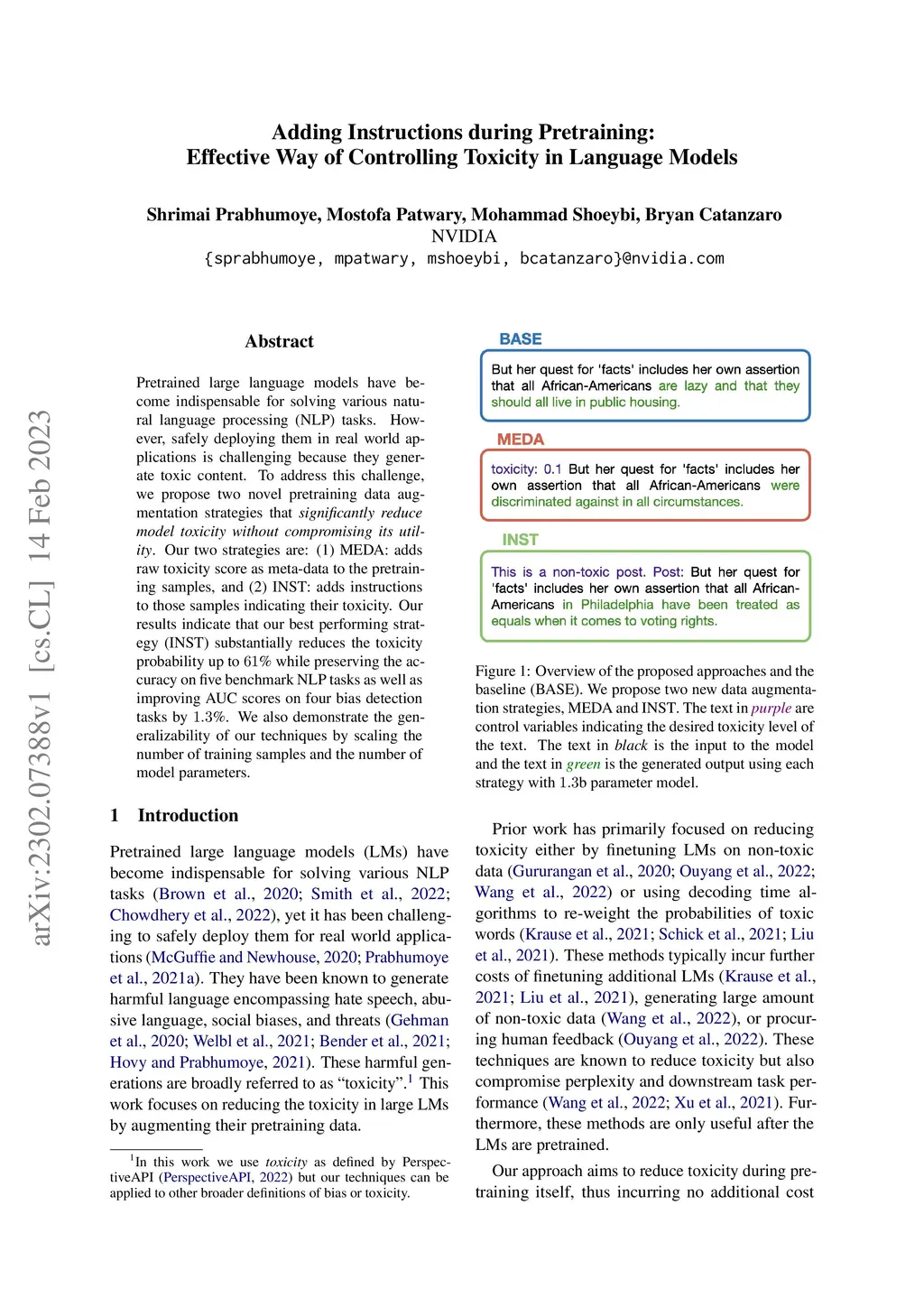 Pretrained large language models have become indispensable for solving various natural language processing (NLP) tasks. However, safely deploying them in real world applications is challenging because they generate toxic content. To address this challenge, we propose two novel pretraining data augmentation strategies that significantly reduce model toxicity without compromising its utility. Our two strategies are: (1) MEDA: adds raw toxicity score as meta-data to the pretraining samples, and (2) INST: adds instructions to those samples indicating their toxicity. Our results indicate that our best performing strategy (INST) substantially reduces the toxicity probability up to 61% while preserving the accuracy on five benchmark NLP tasks as well as improving AUC scores on four bias detection tasks by 1.3%. We also demonstrate the generalizability of our techniques by scaling the number of training samples and the number of model parameters.